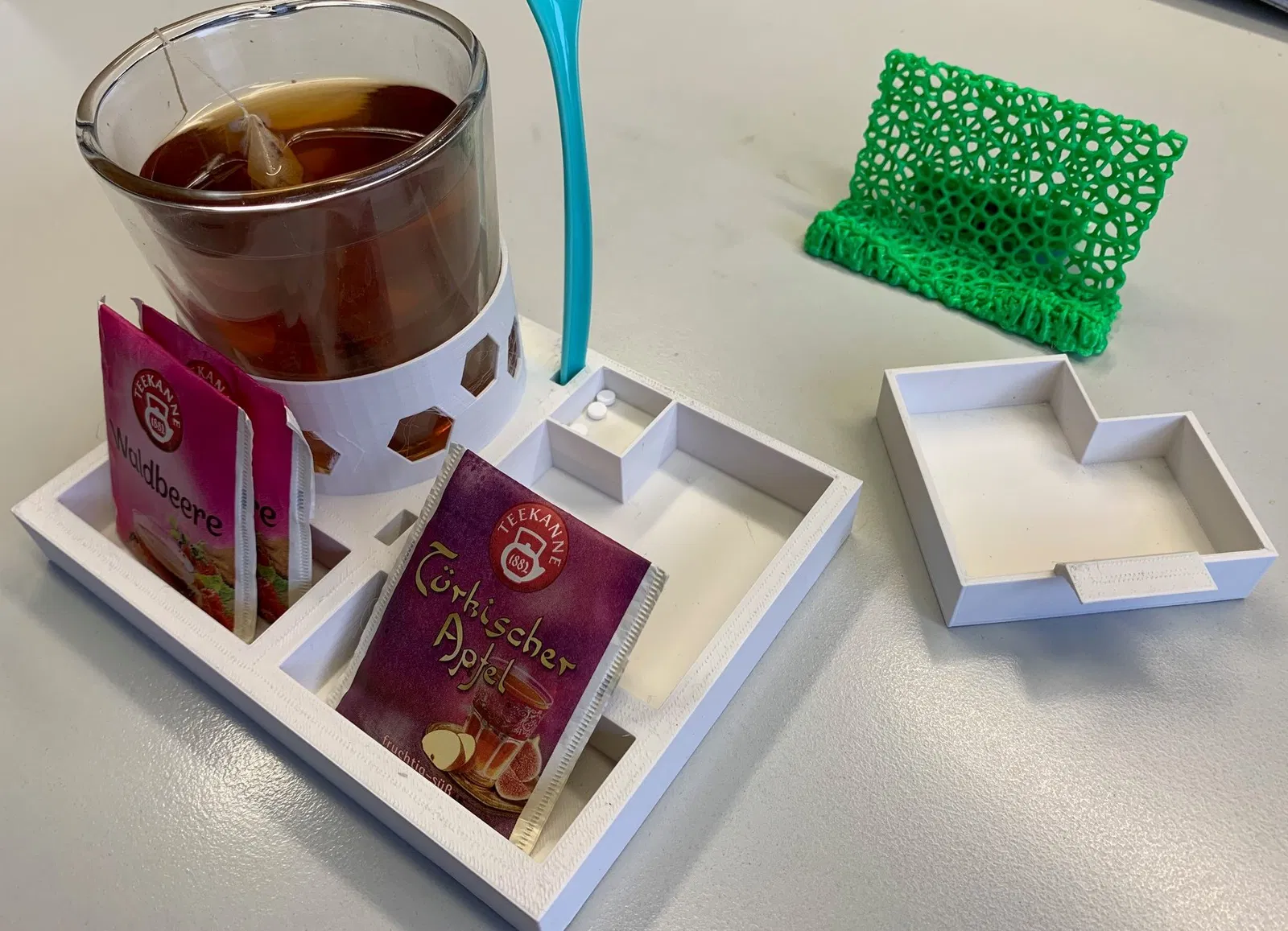 Khay trà đa năng, bao gồm ngăn đựng bã trà, hộp đường, hộp túi trà, chỗ để muỗng và ly trà. Bàn trà TEE có thêm thùng rác, hộp đựng chất tạo ngọt và chỗ giữ muỗng tùy chỉnh. In bằng PETG, độ đặc 20%, không cần hỗ trợ.