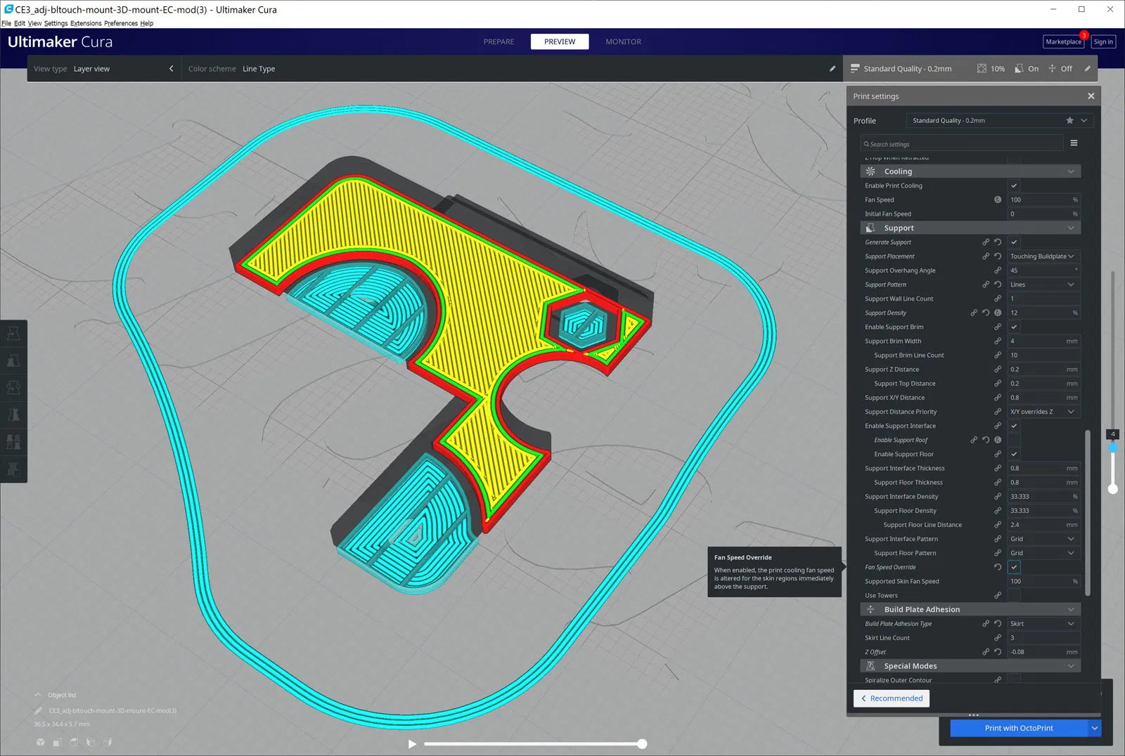 Nếu bạn gặp sự cố với supports bị dính vào mô hình và muốn sử dụng phiên bản ngàm có rãnh cho nắp quạt, bạn có thể cần giảm nhiệt độ một chút. Bạn cũng có thể thử sử dụng supports mà không có lớp lót supports. Dưới đây là các cài đặt được đề xuất có thể hữu ích nếu bạn đang sử dụng Cura (Một số cài đặt này có thể bị ẩn nhưng bạn có thể tìm thấy chúng bằng cách sử dụng biểu tượng bánh răng bên cạnh mỗi tiêu đề trong cài đặt in):