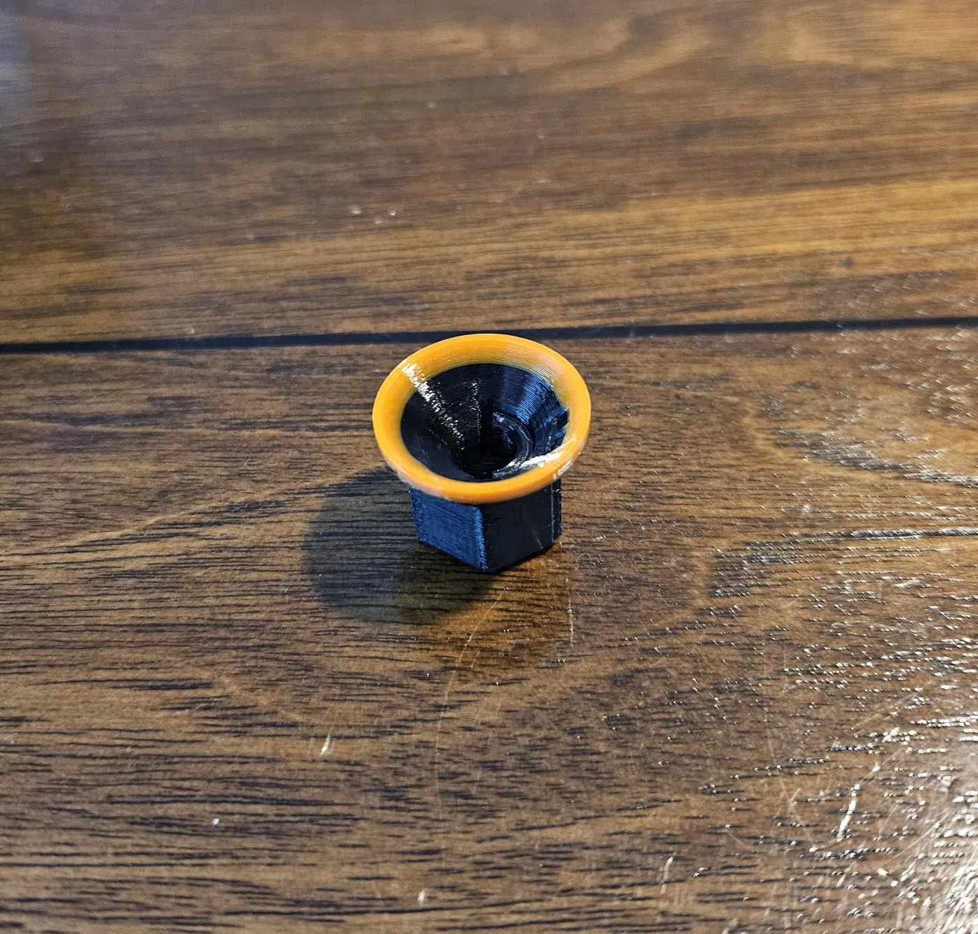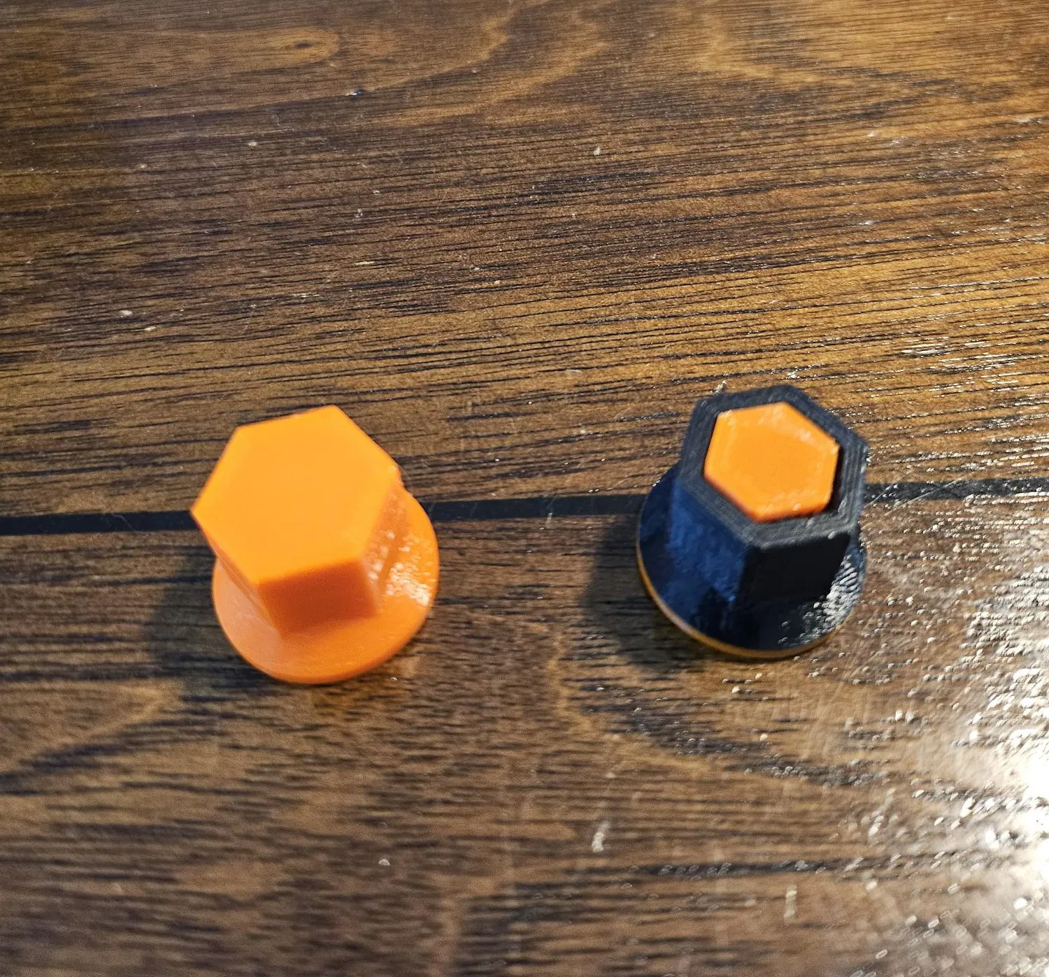 Tôi đã chỉnh sửa nút điều khiển gốc của Prusa để có đầu lục giác. Tôi có để kèm hai phiên bản. Một phiên bản có đầu đặc (xem ảnh màu Cam). Phiên bản thứ hai có phần chèn riêng biệt có thể in màu khác và dán vào (xem ảnh màu Đen). Tôi cũng thêm phần đổi màu ở đỉnh nút cho chiếc màu Đen thêm phần sinh động.