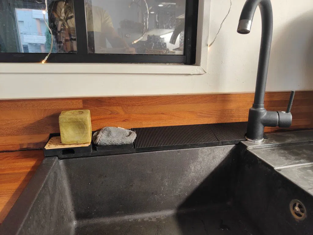 Ngăn nước đọng phía sau bồn rửa chén + cho phép nước từ khay xà bông chảy thẳng vào bồn rửa. Mấy bồ có thể tùy chỉnh file f3d để vừa với bồn rửa chén nhà mình.
