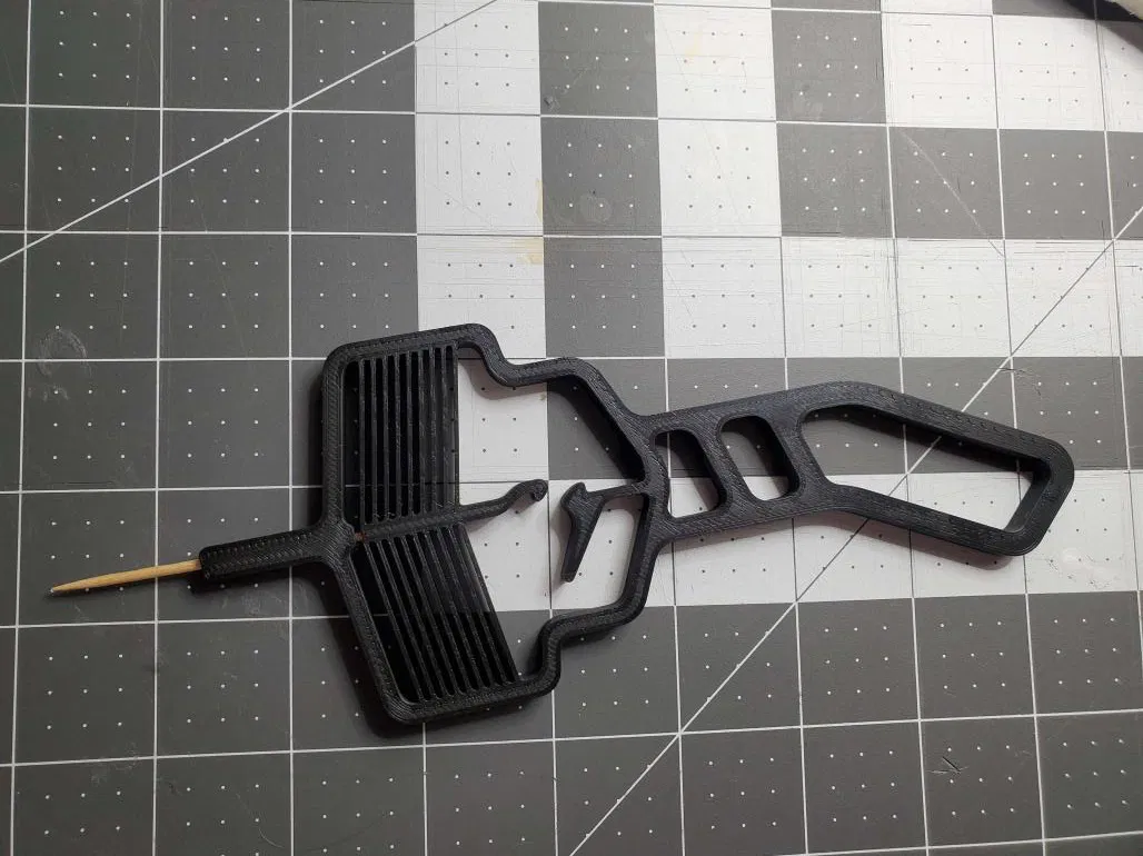 Cái này cũng là một trong mấy cái dự án tui ủ mưu làm từ lâu rồi, giống mấy cái súng thun in-in-place khác của tui. Cái này thiết kế đơn giản, nó có cái cơ cấu đàn hồi (compliant mechanism) đặc biệt bắn tăm ra khi bóp cò.