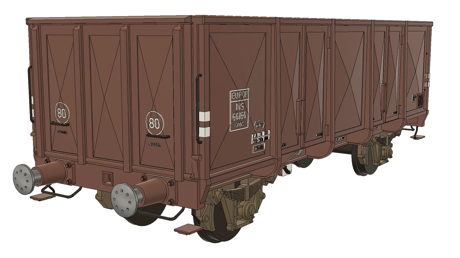 Bản thiết kế toa chở than GTU của Nederlandse Spoorwegen với tỷ lệ 1:32 / Gauge 1. Đã cập nhật để dễ lắp ráp hơn, bao gồm tùy chọn vòng bi, sử dụng dây đồng/thép cho bậc thang và tay vịn, và các bộ phận giảm chấn có lò xo.