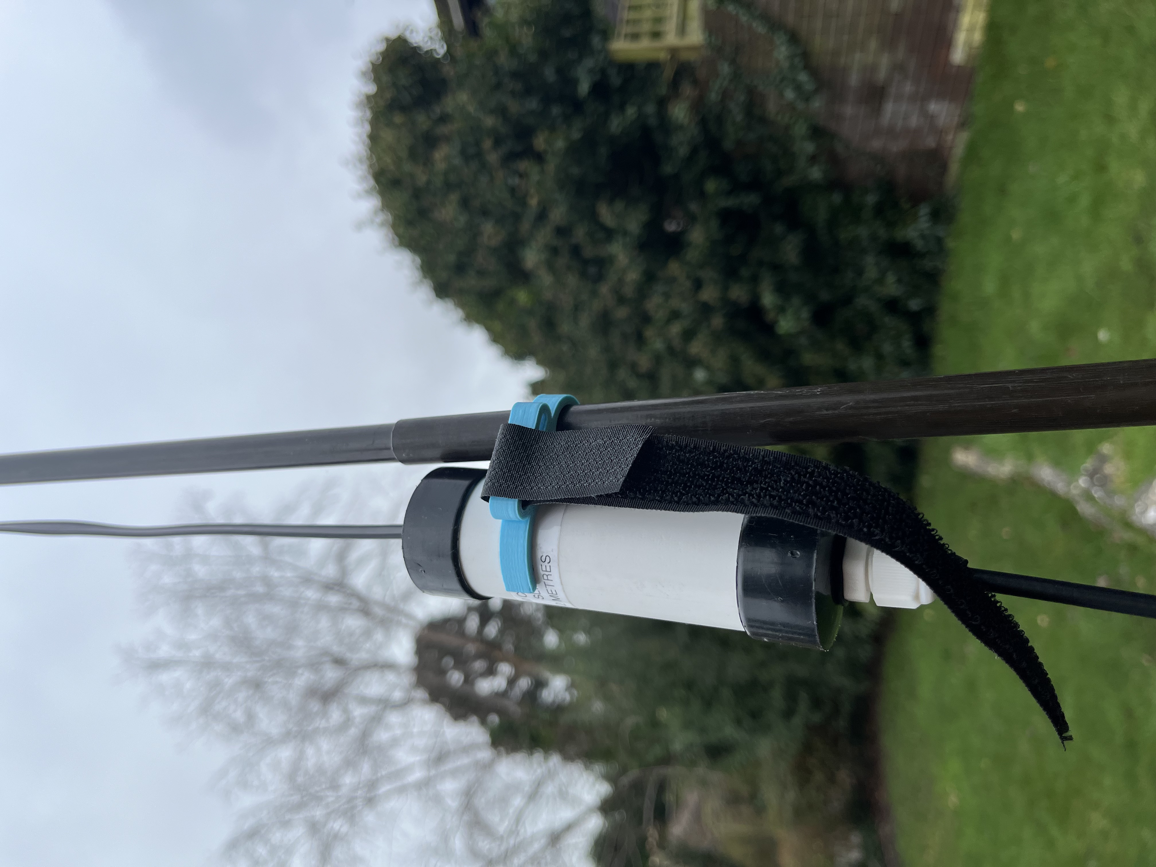 Kẹp gắn anten Slim G 2m vào cột, giúp chống bay phất phới và giữ anten sát cột khi trời gió, rất tiện cho SOTA. Có khe gắn velcro.