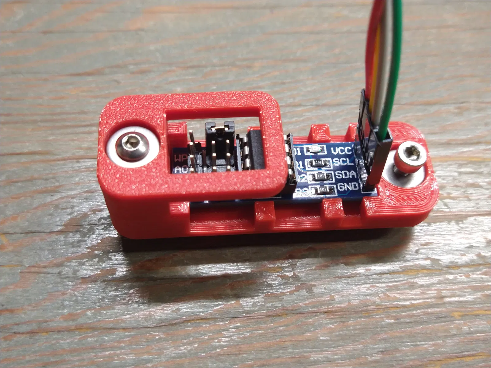 Giá đỡ cho Module Bộ nhớ EEPROM AT24C256 I2C cho thanh nhôm 2020. Tôi đang sử dụng cái này cho bo mạch BTT SKR 1.4 trên máy in delta tự chế của mình. Cái này kẹp nhẹ module EEPROM và có các cạnh hở để thông gió, mặc dù tôi không chắc là chúng có bị nóng không. Tôi đã tự làm dây cắm Molex của mình.
