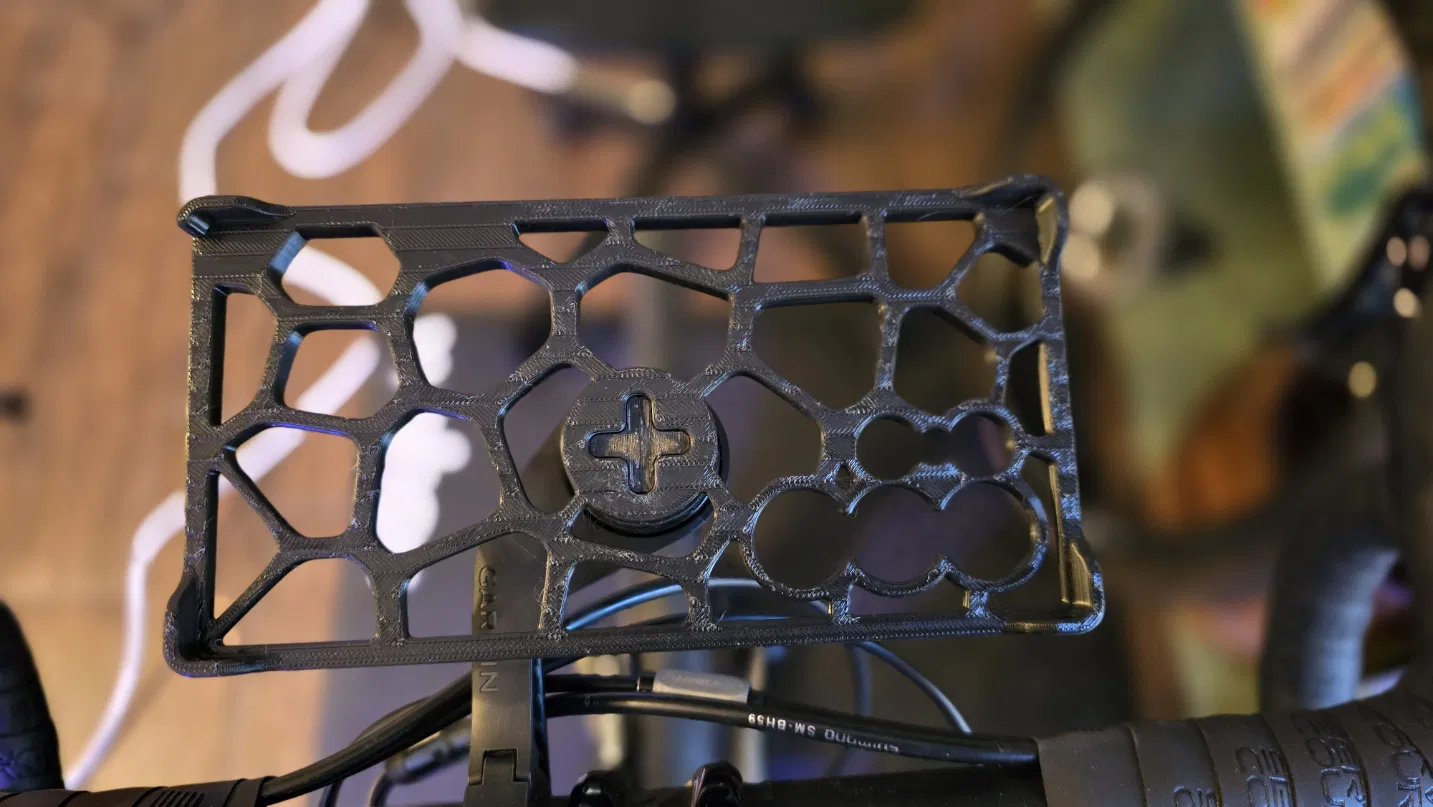 Khay đựng điện thoại S24 Ultra gắn vào giá đỡ Garmin Edge/Wahoo, giữ điện thoại ở hướng ngang khi đang quay. Có lỗ ốc 2mm nhưng keo siêu dính là đủ.