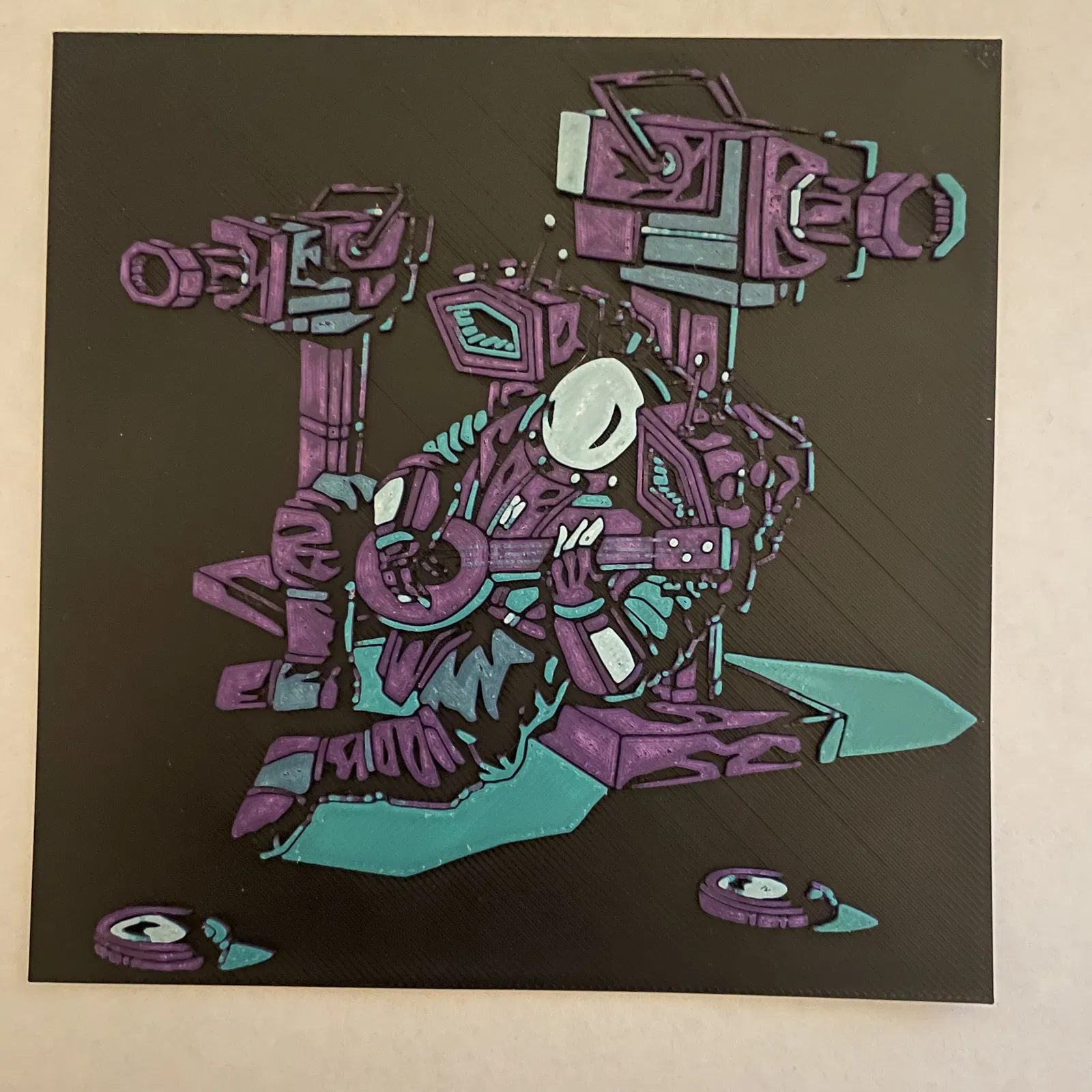 Mô hình Kỹ Sư (Engineer) từ tựa game Risk of Rain 2, được tạo ra bằng HueForge. Bản in yêu cầu độ chi tiết cao với nhiều lần đổi màu filament PLA+ để tái hiện màu sắc. Credit hình ảnh gốc thuộc về u/rkffkvkrhs.