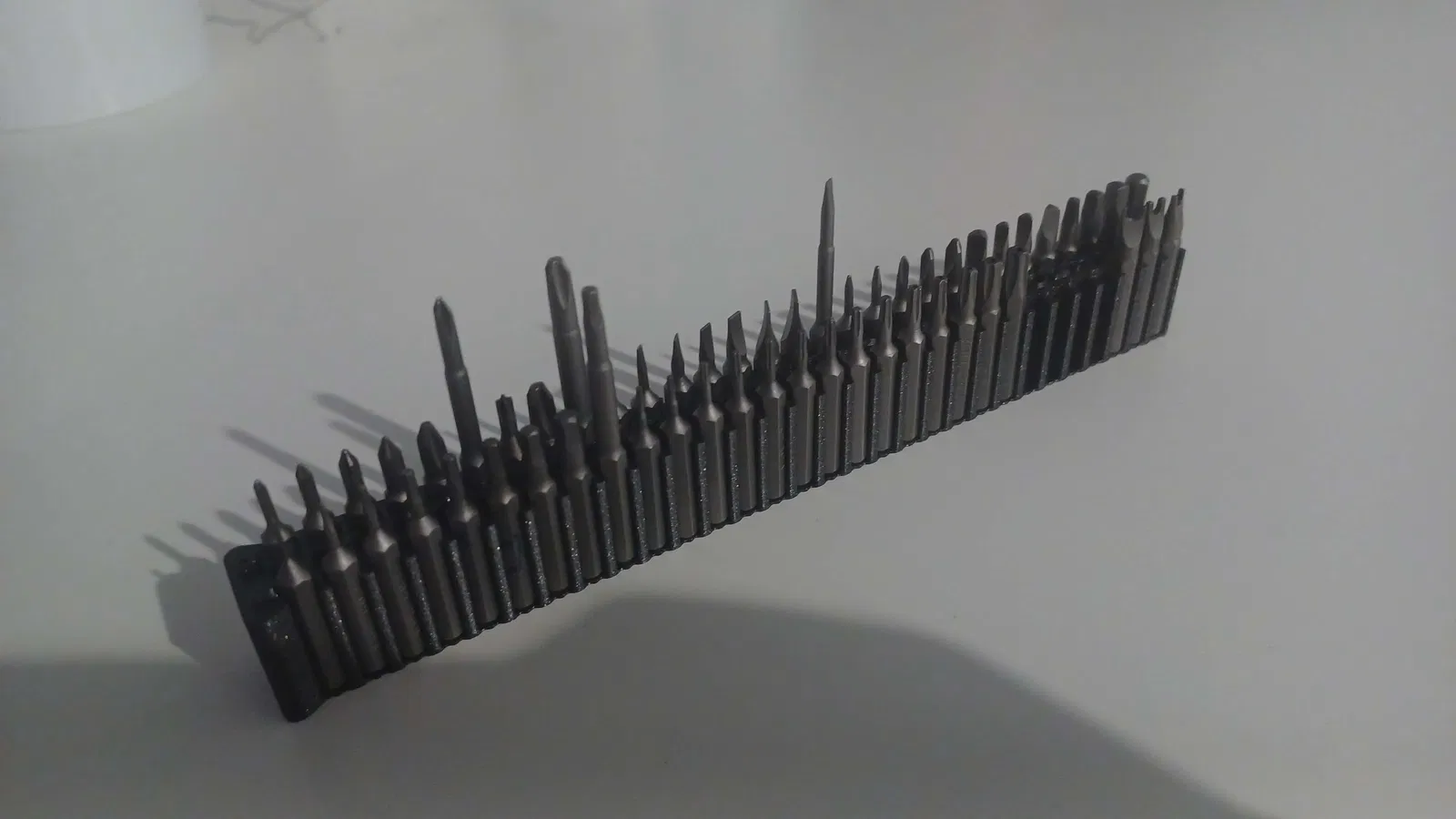 Cái giữ bit 1/4in đơn giản, chứa được tới 60 cái bit. Có 2 lỗ ren M4 ở đáy để gắn lên đế. Lỗ được làm lớn hơn 0.2mm cho vừa vặn hơn (hơi lỏng). Cứ tự nhiên hỏi nếu cần sửa đổi/vá lỗi gì nha.
