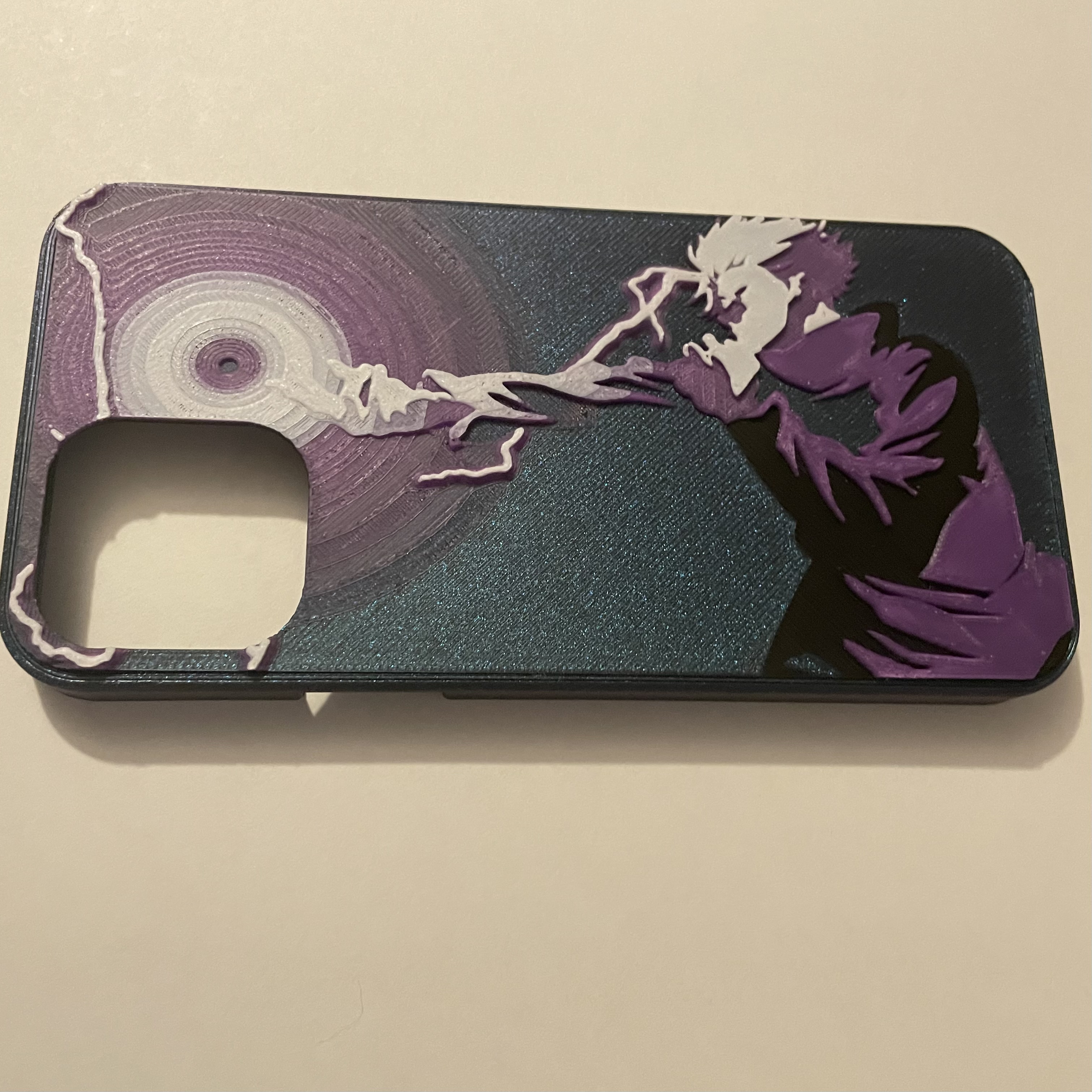 Thiết kế ốp lưng điện thoại HueForge hình Gojo từ "Chú Thuật Hồi Chiến". Hướng dẫn in chi tiết cho file STL và ốp lưng, bao gồm thông số máy in, vật liệu PLA+ và các bước đổi màu để tạo ra sản phẩm độc đáo.