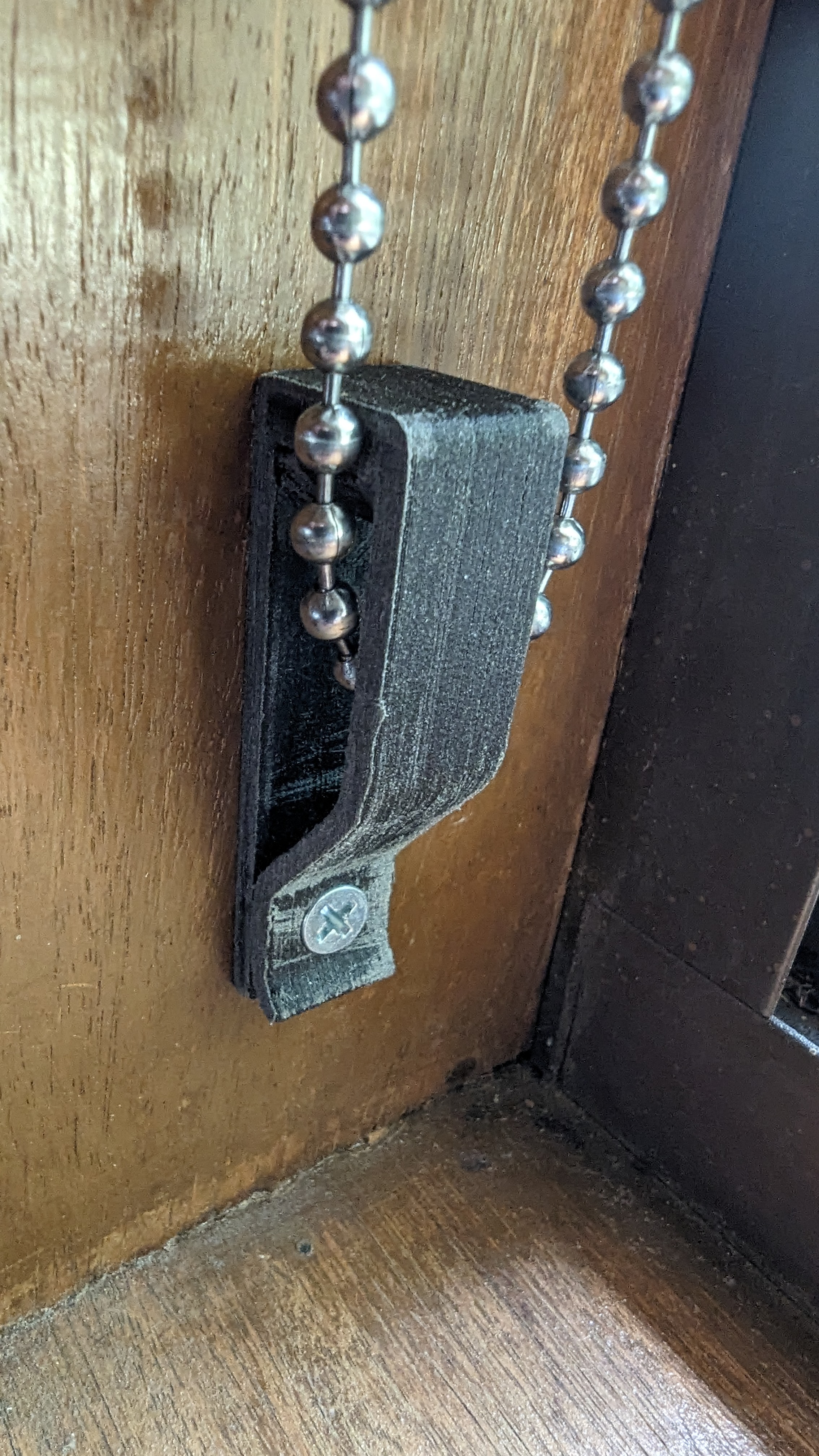Cái này là bộ phận thay thế cho cái kẹp an toàn của sợi dây con lăn rèm, có lỗ bắt vít âm được khoét theo cỡ của vít 8G (vì tui chỉ có loại đó thôi!).