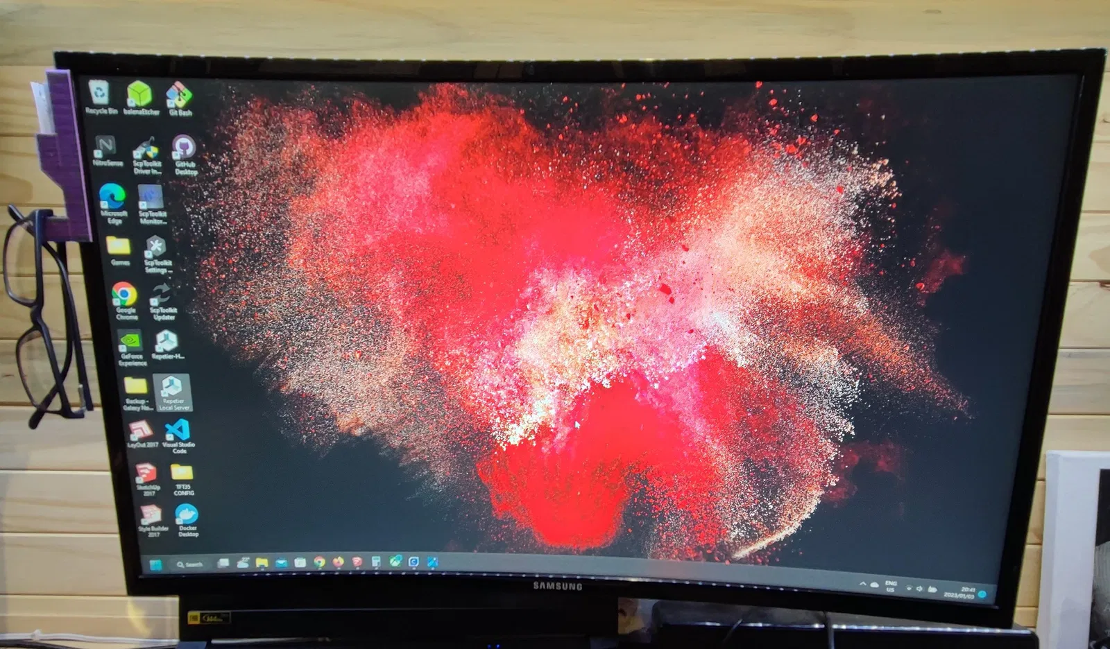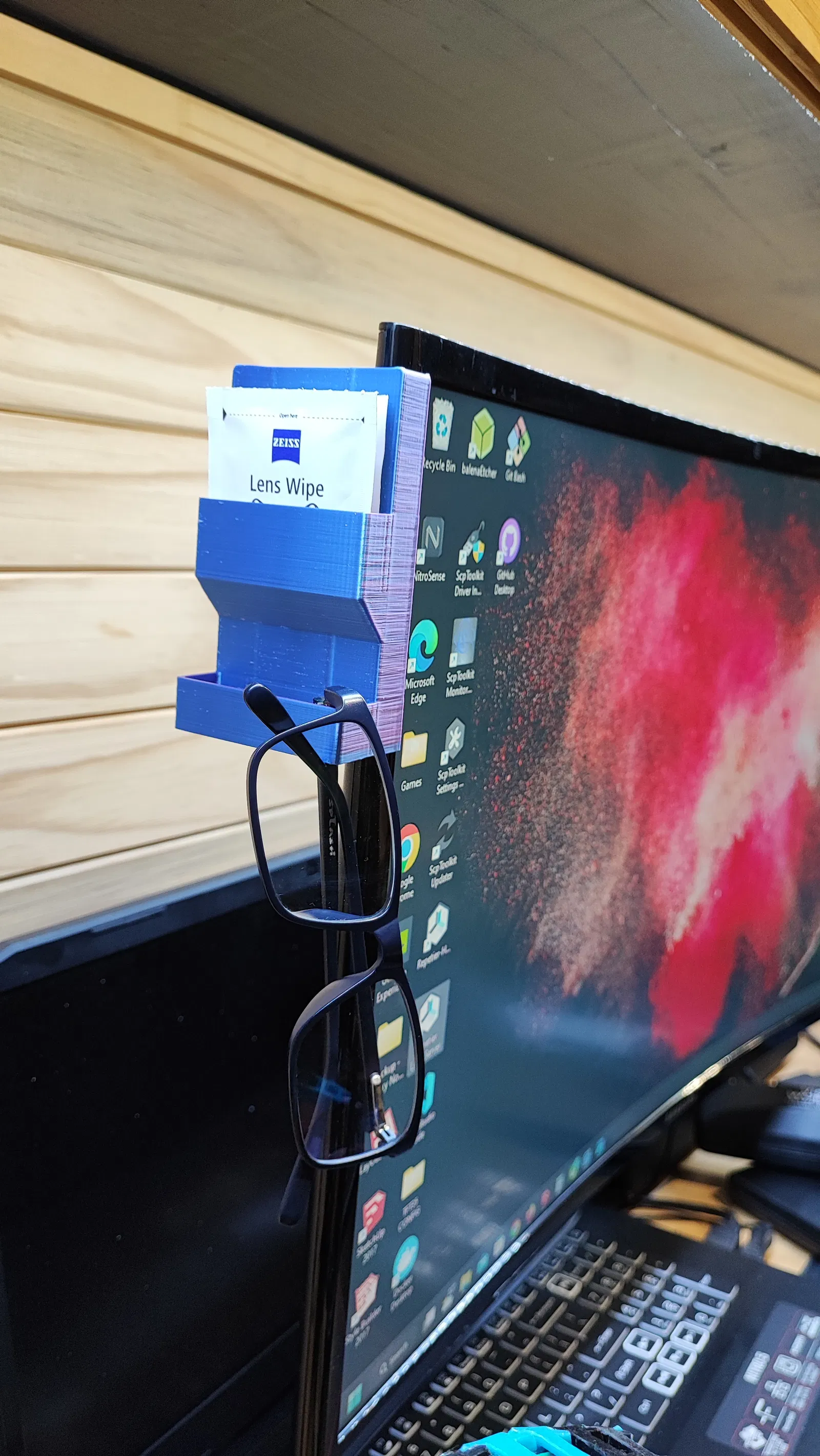 Chỗ để kính đơn giản, gắn thẳng lên màn hình máy tính. Có chỗ treo kính và ngăn nhỏ đựng đồ. Gắn bằng băng keo hai mặt, có thể chỉnh kích thước cho vừa màn hình khác. Có 2 loại: có mái che và không có mái che. In bằng PLA, đầu phun 0.6mm.