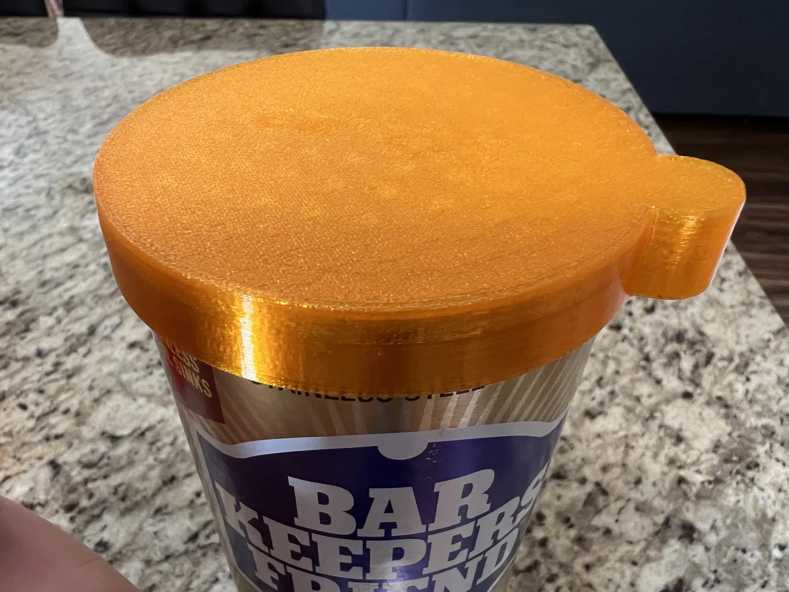 Nắp đậy "Barkeeper's Friend's Friend" vừa khít lon Barkeeper's Friend 21oz, giúp ngăn hơi ẩm và chống rỉ sét đáy lon. Nên in bằng TPU hoặc vật liệu dẻo.