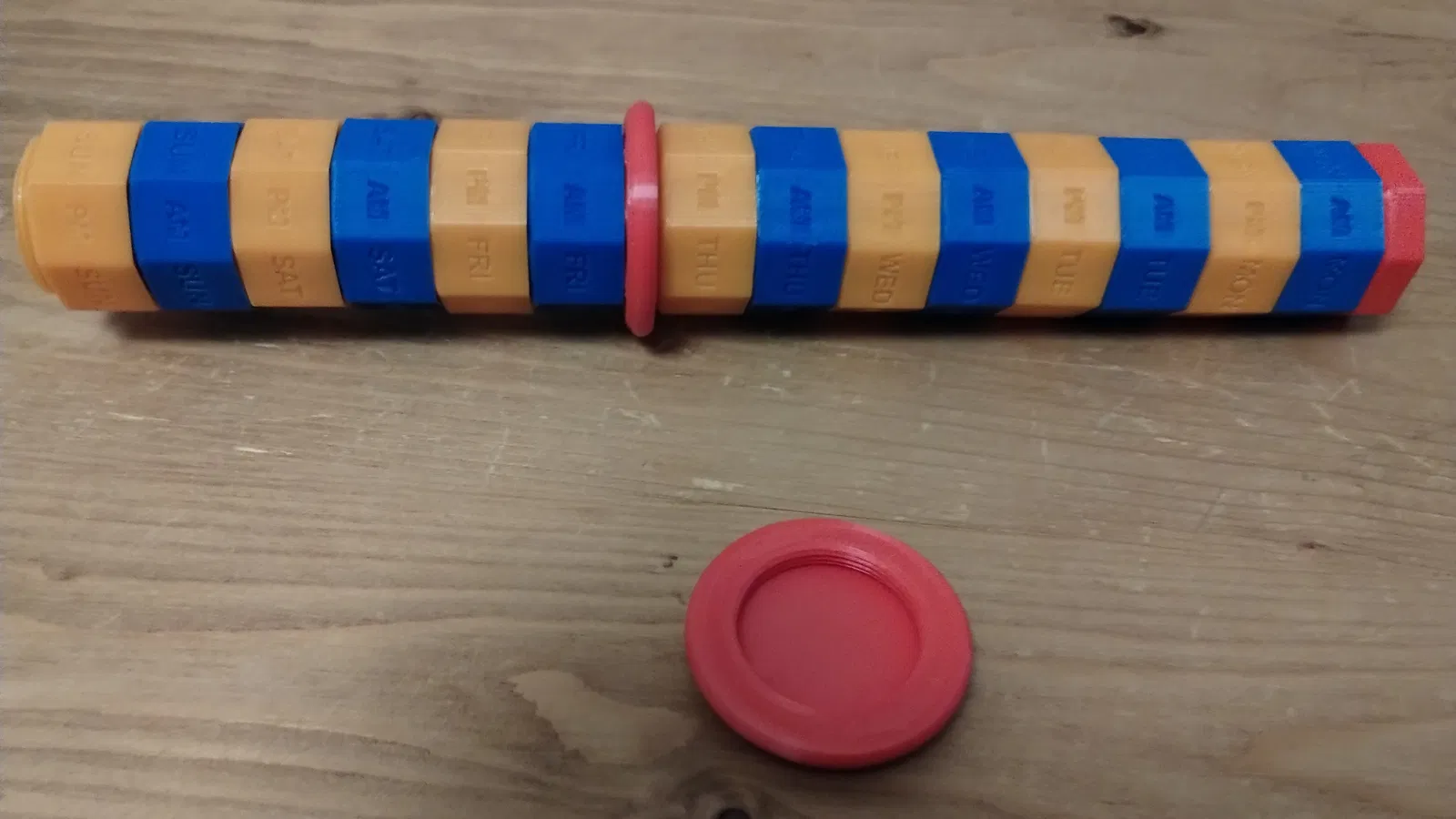 Ống Đựng Thuốc, Bản Chỉnh Sửa: Chia thuốc của bạn vào hộp đựng thuốc dễ sử dụng này. Mỗi phần vặn vào nhau tạo thành ống đựng thuốc cả tuần, có 4 ngăn (Sáng, Chiều, Trưa, 1 ngày) với nhãn rõ ràng. In ở tỉ lệ 100% cho đường kính 35mm, 80% cho đường kính 28mm. Có miếng ngăn cách cho ống rỗng.