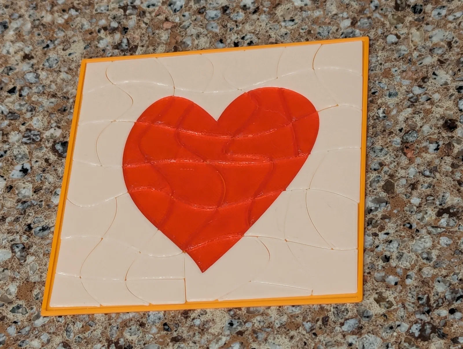 Mô hình ghép hình trái tim đơn giản, in bằng PLA, được tạo bằng Fusion 360. Thích hợp cho người mới bắt đầu, có thể tùy chỉnh độ dày khi in.
