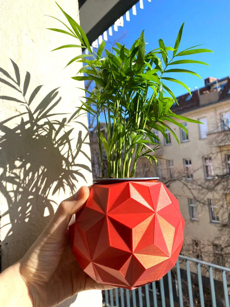 Chậu cây Geodesic Planter Pot dựa trên hình lục giác hexecontahedron độc đáo. In không cần trụ đỡ, chỉ cần chỉnh kích thước. Có phiên bản có lỗ thoát nước và tối ưu hóa cho in không cần support. Lý tưởng cho trang trí ngoài trời.