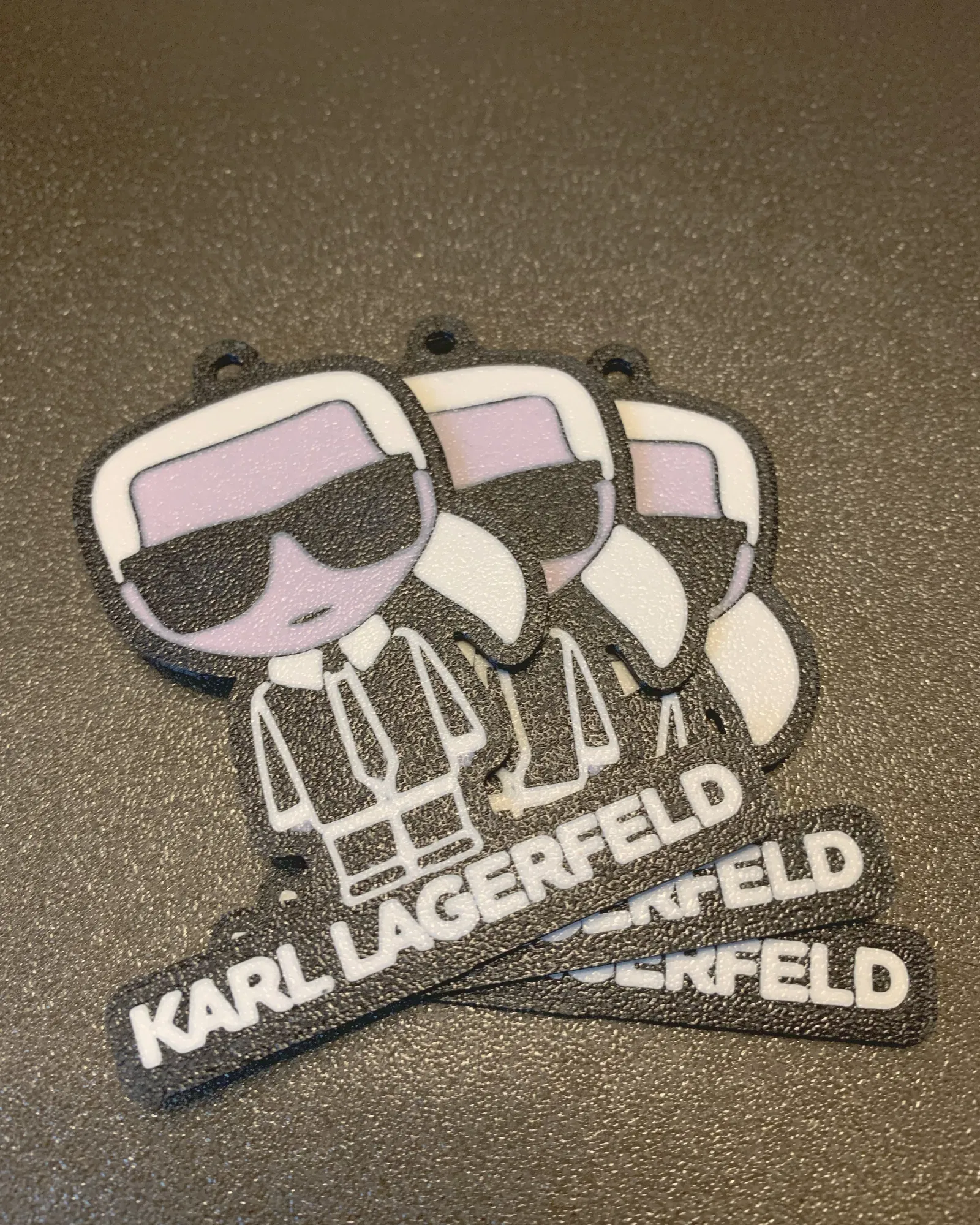 Tạo logo móc khóa Karl Lagerfeld theo phong cách độc đáo, phù hợp in với máy in đa vật liệu (MMU). Kích thước 7x7.5cm, khuyến khích in mặt màu hướng xuống tấm nền để có bề mặt đẹp. Mô hình tối ưu thời gian đổi màu, in bằng đầu phun 0.4mm.
