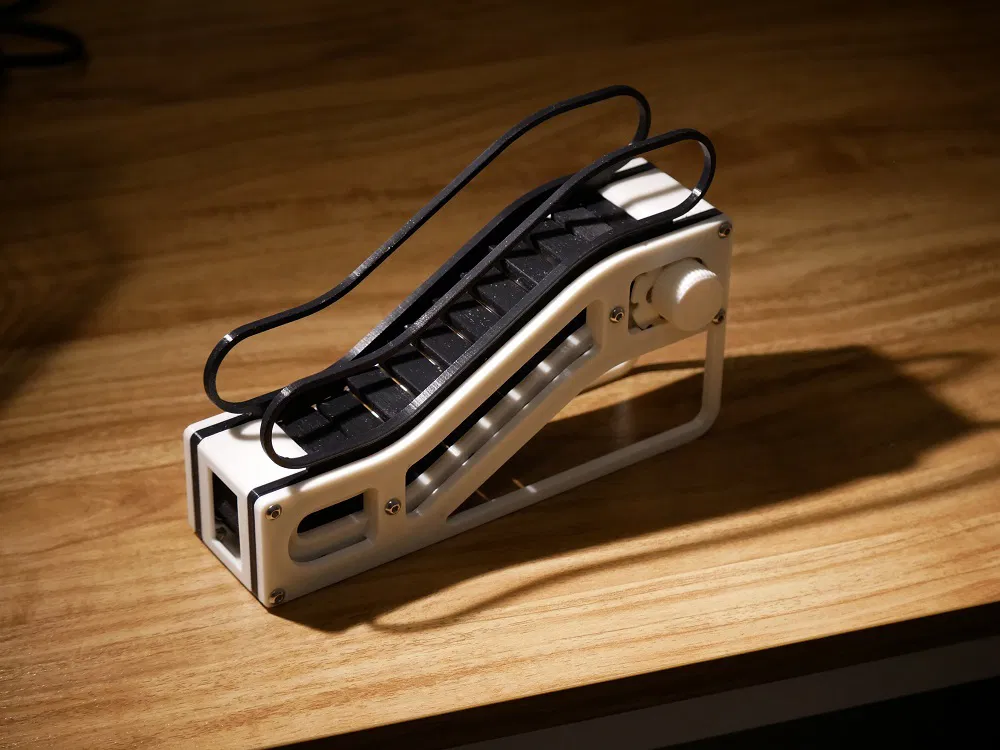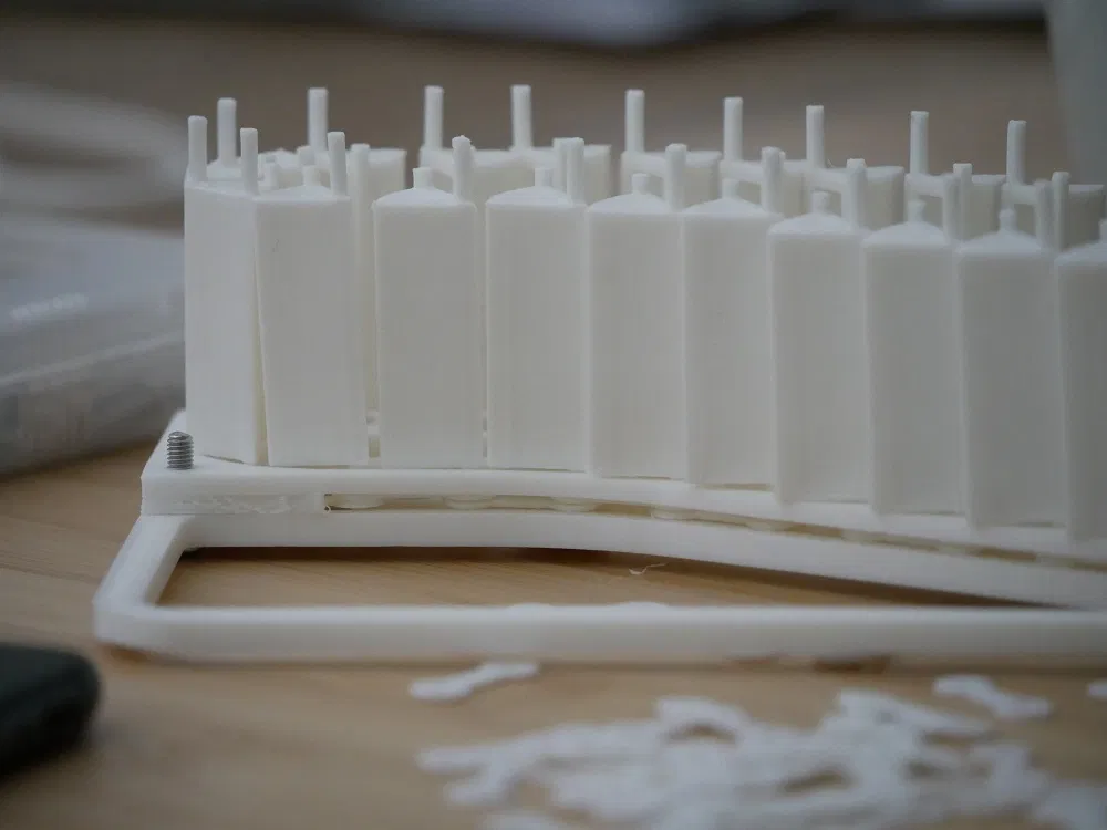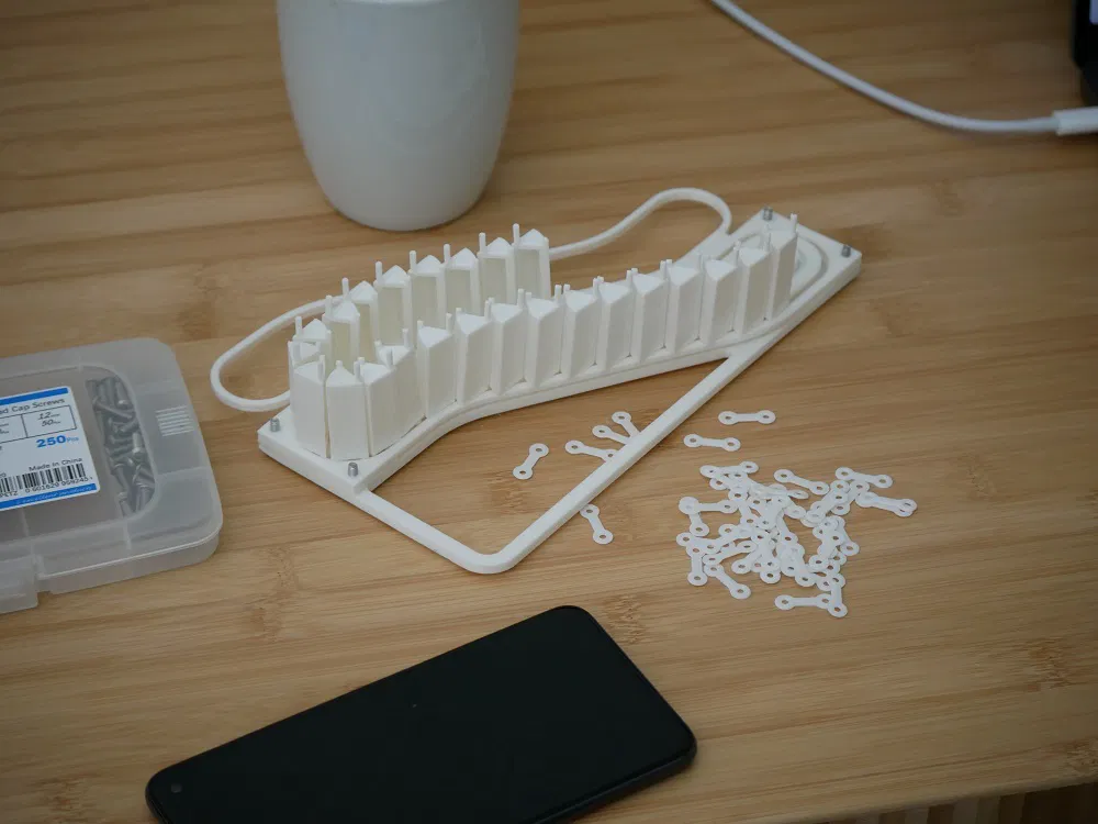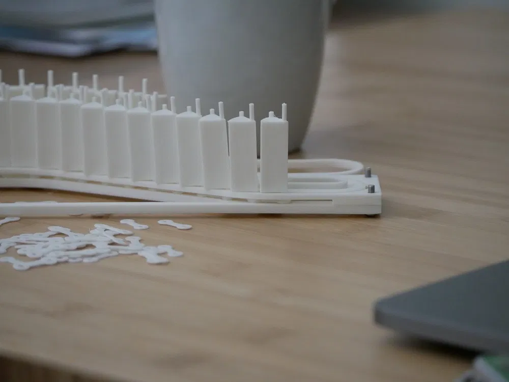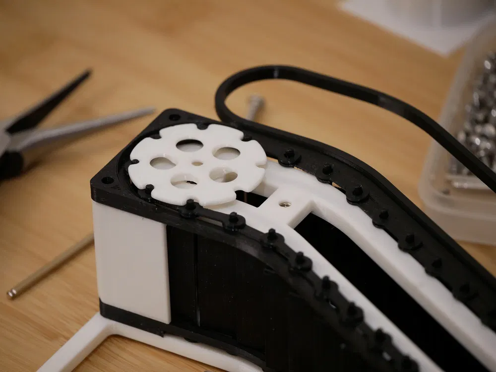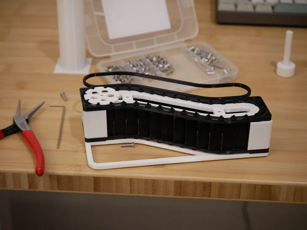 - 12 đai ốc M3 ### Bộ phận in In 64 mắt xích, 32 bậc thang và 2 tấm cuối. In 1 của mỗi bộ phận còn lại. Điều quan trọng là máy in của bạn phải được cân chỉnh tốt và phẳng trước khi in các bộ phận này. Đặc biệt là các bậc thang rất nhạy cảm với việc cân bằng mặt bàn/độ bám dính. Bạn sẽ muốn lớp đầu tiên chỉ ép nhẹ vừa đủ để ngăn ngừa cong vênh; bất kỳ sự ép quá đà hoặc chân voi nào cũng sẽ ngăn các bậc thang hoạt động trơn tru. Tôi khuyên bạn nên áp dụng một số bù chân voi trong slicer để đảm bảo lớp đầu tiên có chiều rộng tương tự như các lớp khác. Nó cũng có thể hữu ích nếu bạn dùng dụng cụ vát mép để làm sạch các thanh dẫn đường ray cho mọi thứ được trơn tru. Ngoài ra, một ít keo nóng hoặc keo siêu dính trên các đai ốc sẽ giúp ngăn chúng rơi ra khỏi ổ cắm. ### Lắp ráp Phần này khá khó. Tôi đã lắp ráp theo thứ tự sau: 1. Bắt đầu với phía bên phải, đặt thanh dẫn bên ngoài bên phải lên bề mặt làm việc của bạn.