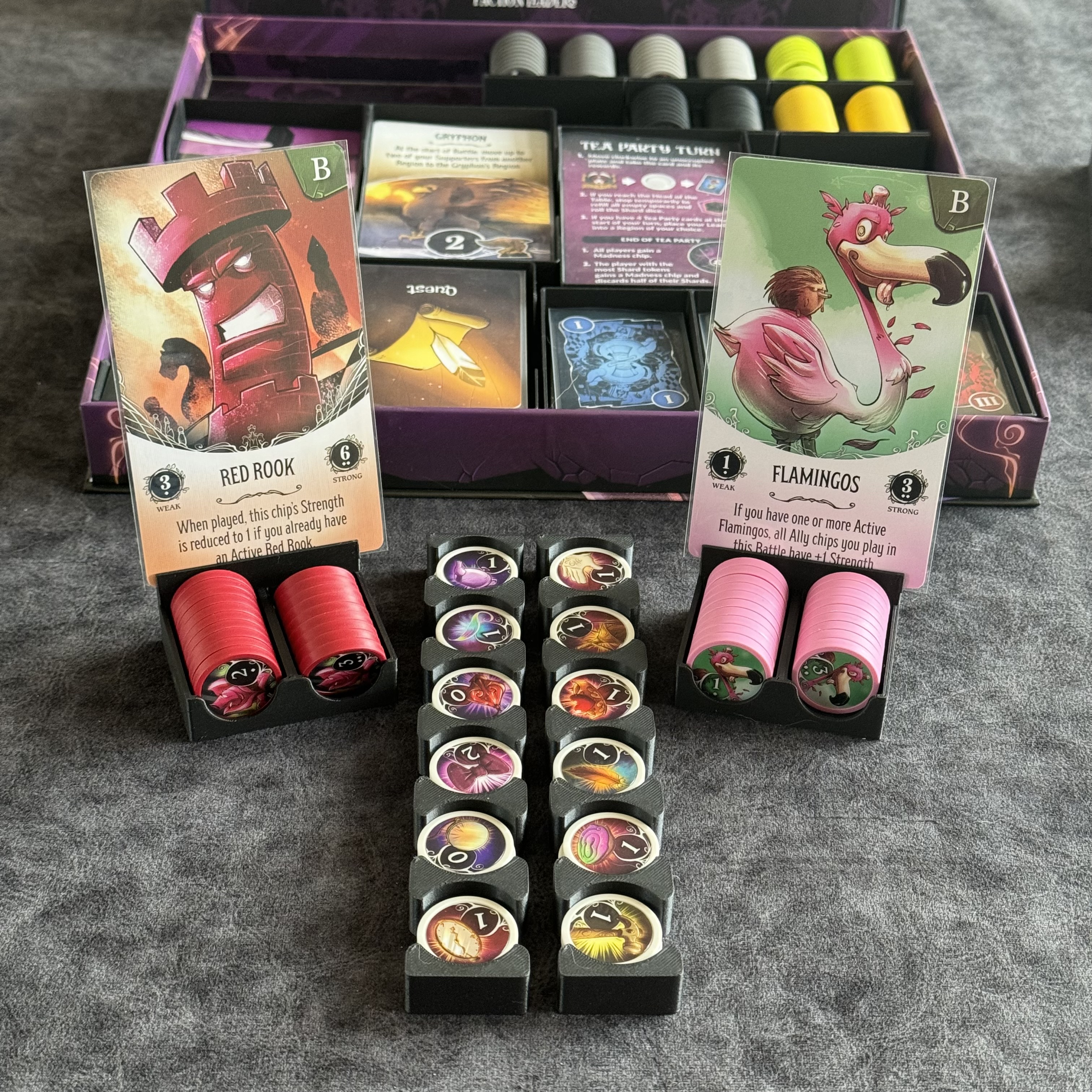 Bây giờ thì tất cả chip VÀ lá bài đều vừa vào hộp chip deluxe, cùng với một vài token. Các khay đựng chip cũng có thể dùng để trưng bày lá bài Ally (xem ảnh). Có nhiều thiết kế tương tự đã có sẵn, tôi chỉ tạo ra cái mới này để khớp vào hộp này cùng với các khay đựng bài.