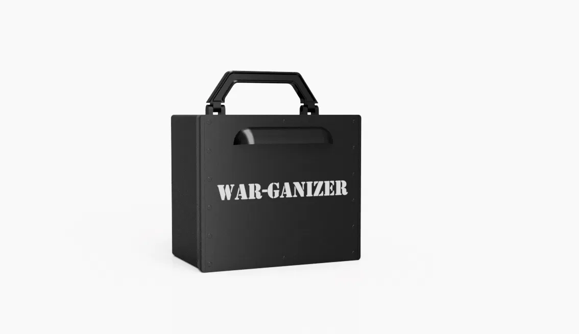 Đây là phiên bản gốc của War-Ganizer. Nó là một hộp đựng cho các Mô hình và các bộ phận cho Wargame trên bàn, nhưng bạn có thể dùng cho bất cứ thứ gì. Cần một ít keo siêu dính để gắn tay cầm và các chốt tay cầm. Tôi đã thêm một vài khay cơ bản để bạn bắt đầu. Bạn có thể tìm thêm các sản phẩm War-Ganizer tại War-Ganizer.ca