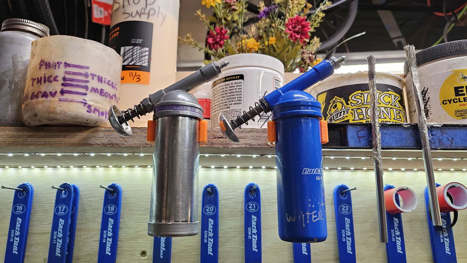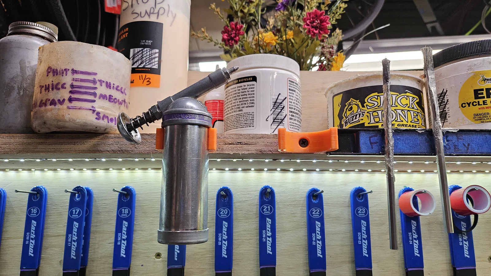 Giá treo tường tiện lợi dành cho súng bơm mỡ Dualco, Park Tool và các loại tương tự. Giúp bạn giữ gọn gàng không gian làm việc, dễ dàng truy cập dụng cụ sửa chữa xe đạp.