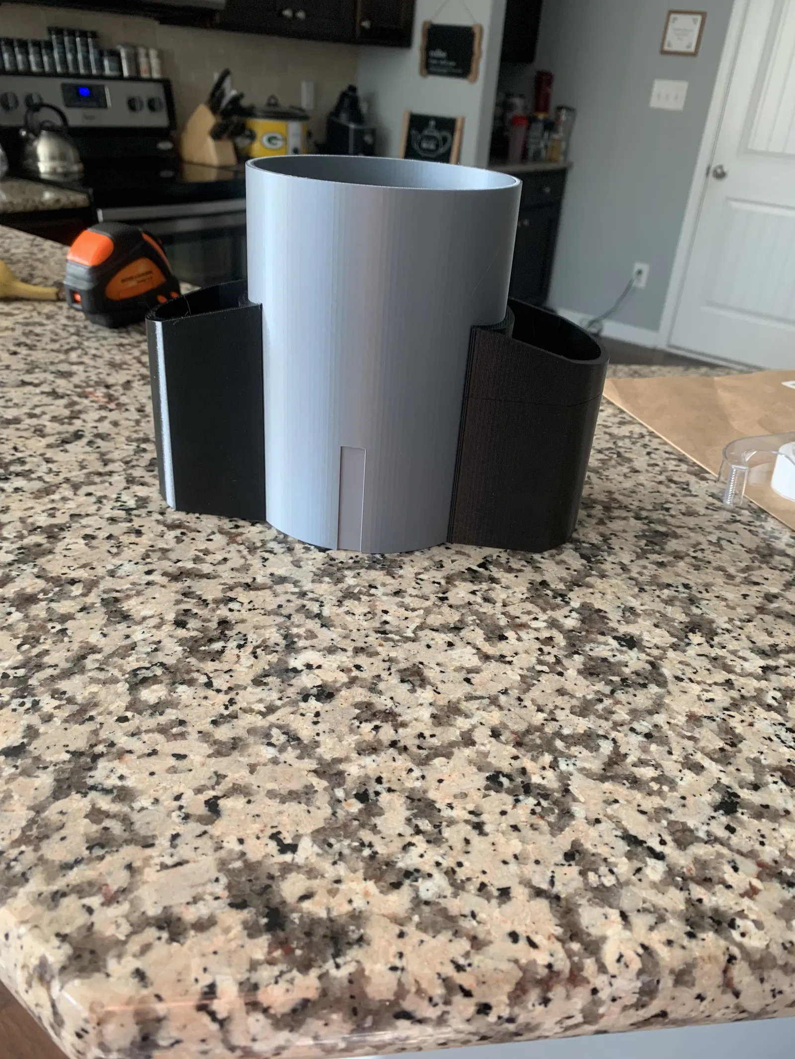 Phần đế và các cốc dùng khớp nối đuôi én để định vị. In 1-4 cốc phụ để tùy chỉnh theo nhu cầu, có thể dán cố định nếu muốn. Có thể dùng trong bếp, văn phòng, xưởng...