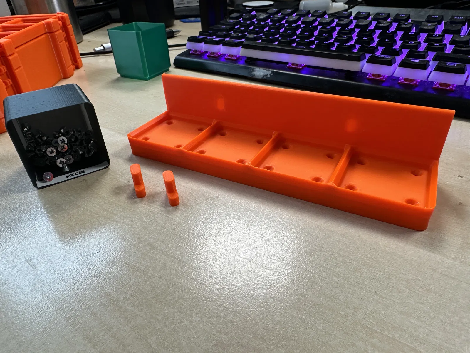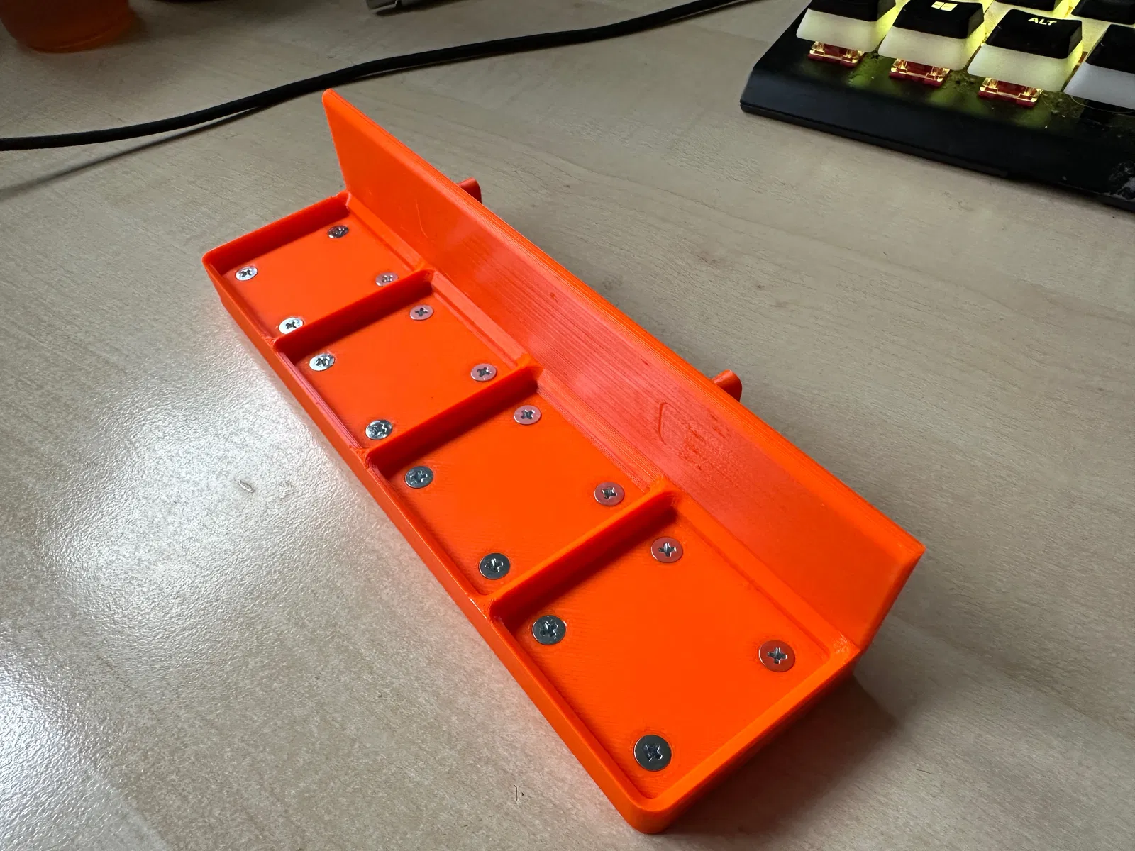 Cái này là một cái đế Gridfinity 4x1, gắn được lên kệ Skadis luôn. Có kèm file móc ép hoặc dán keo, tùy bà con xài. Ốc vít thì tùy chọn, chỉ cần thiết nếu xài nam châm thôi.