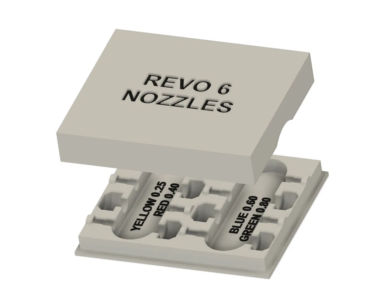 Hộp đựng đầu phun Revo Six dạng khớp trượt, dựa trên thiết kế của @Lichtjaeger. Có hai phiên bản đáy (có/không chữ) và phần nắp vừa khít, dễ tháo. In bằng PETG, đầu phun 0.4mm, lớp dày 0.2mm.