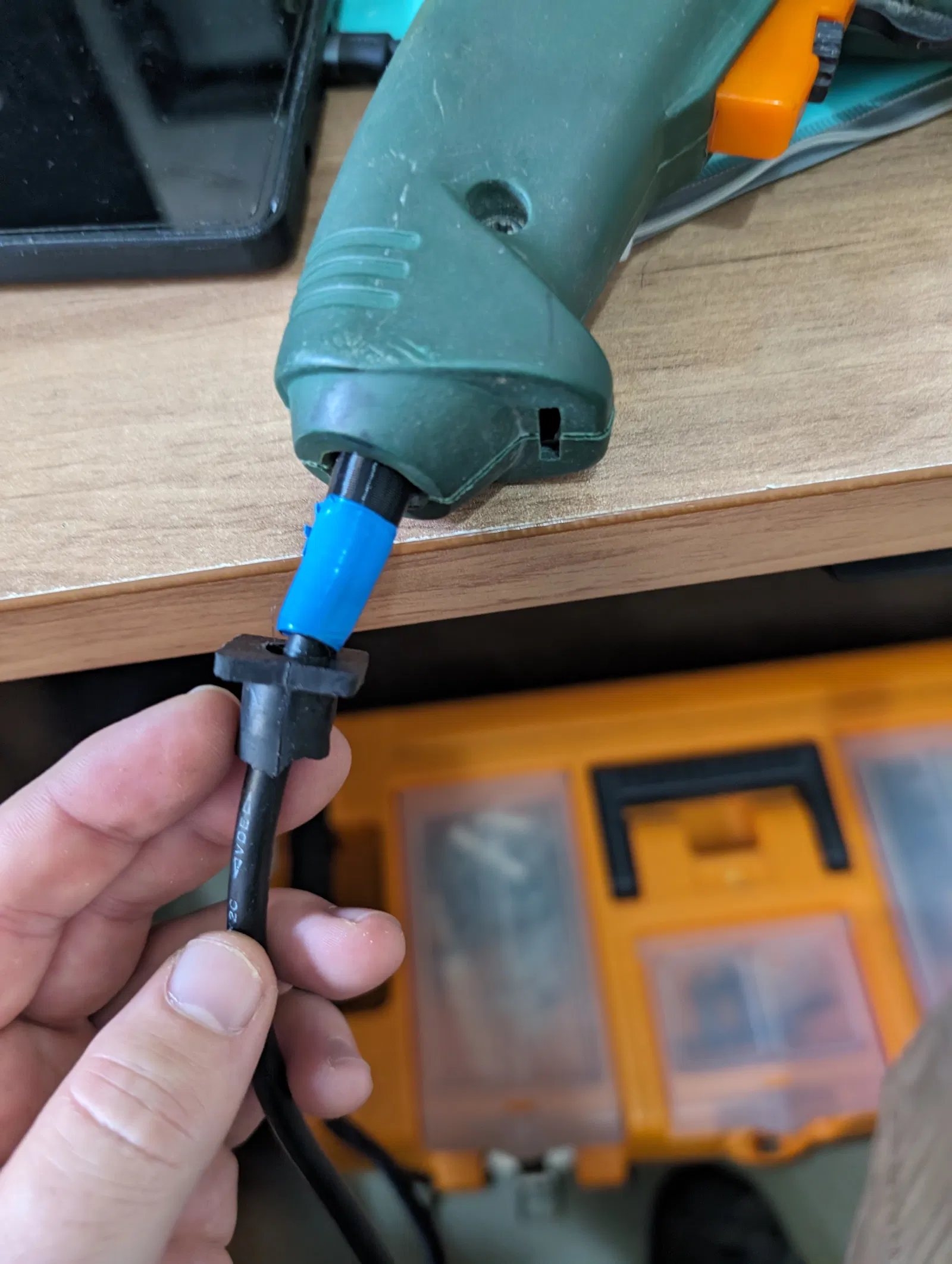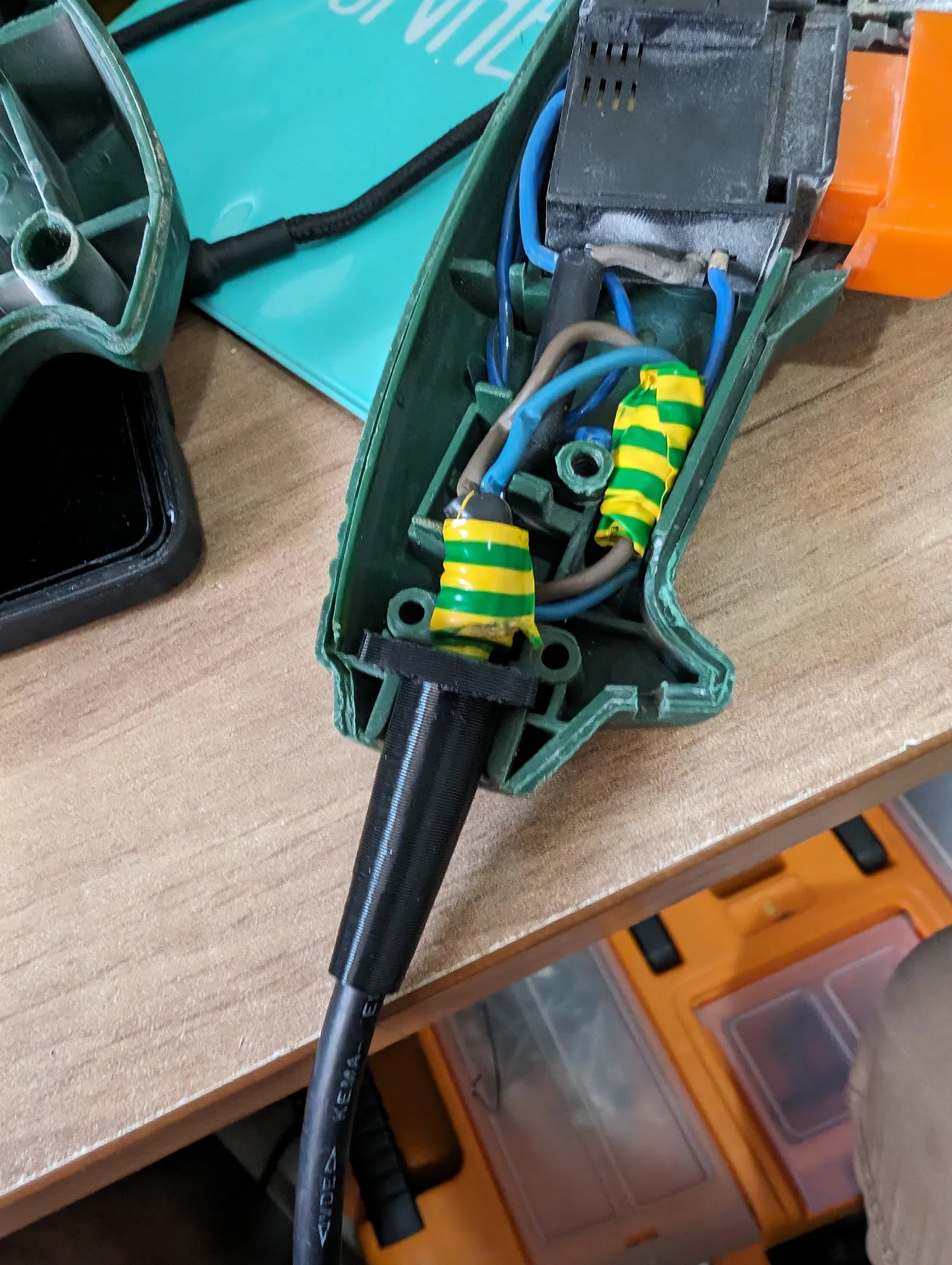 Cái máy khoan của tui bị gãy cái chỗ bọc dây cáp rồi, nhìn thấy ghê. Tôi lẹ làng làm cái mới, có khe để khỏi cần phải tháo cả cái dây ra. Chỉ cần dán thêm miếng băng keo sau khi lắp là được. In bằng TPU nha anh em ơi.