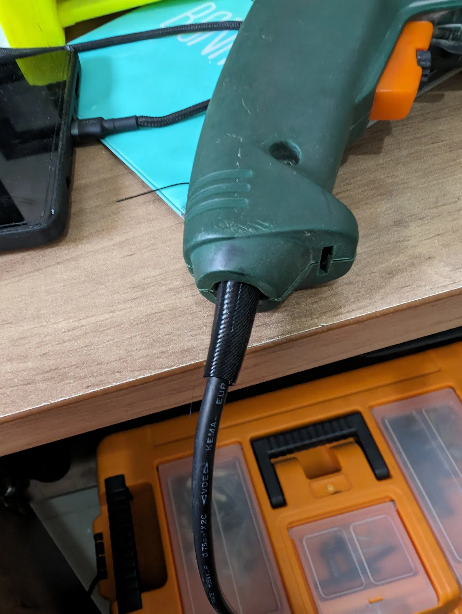 Cái máy khoan của tui bị gãy cái chỗ bọc dây cáp rồi, nhìn thấy ghê.