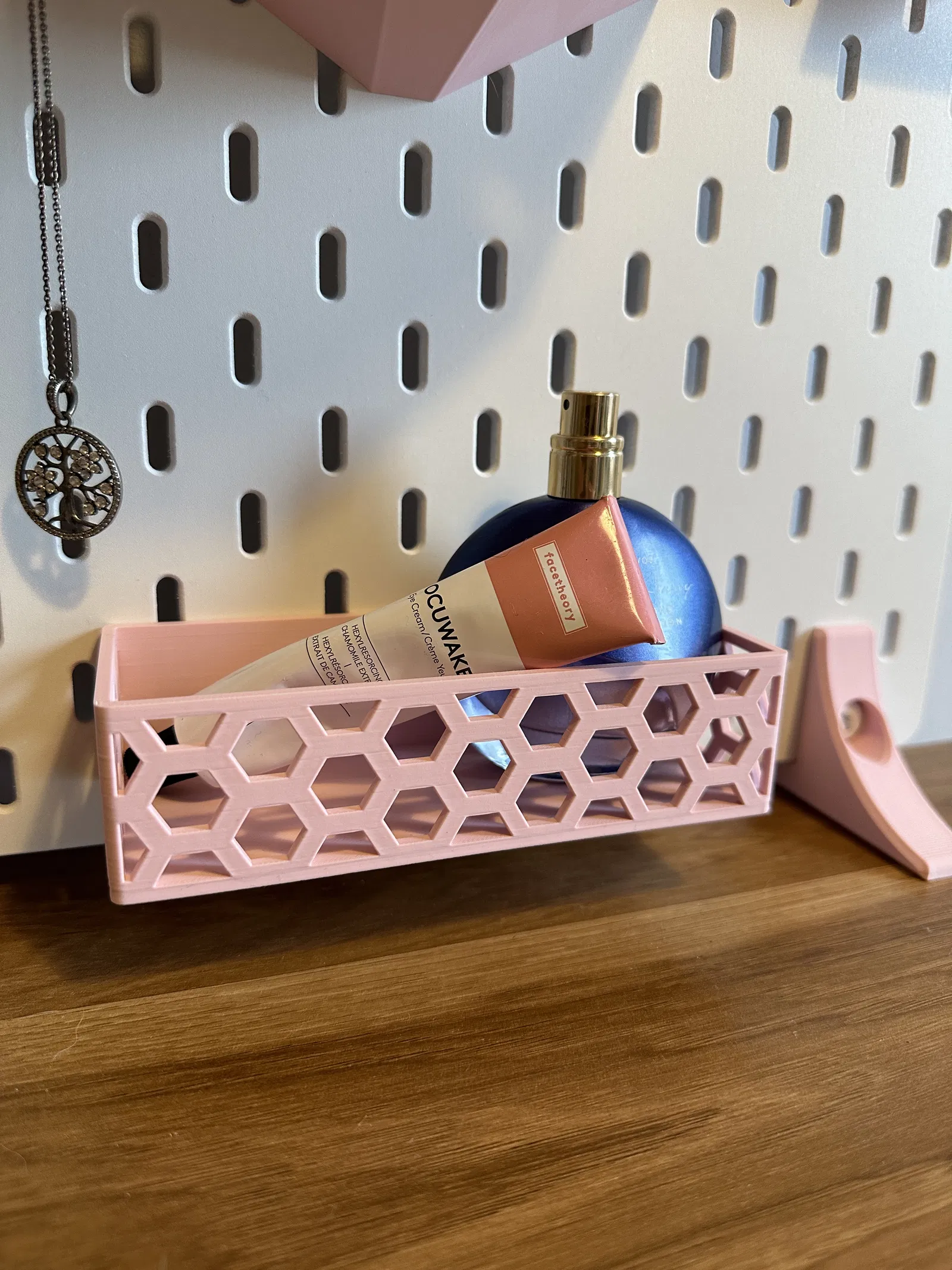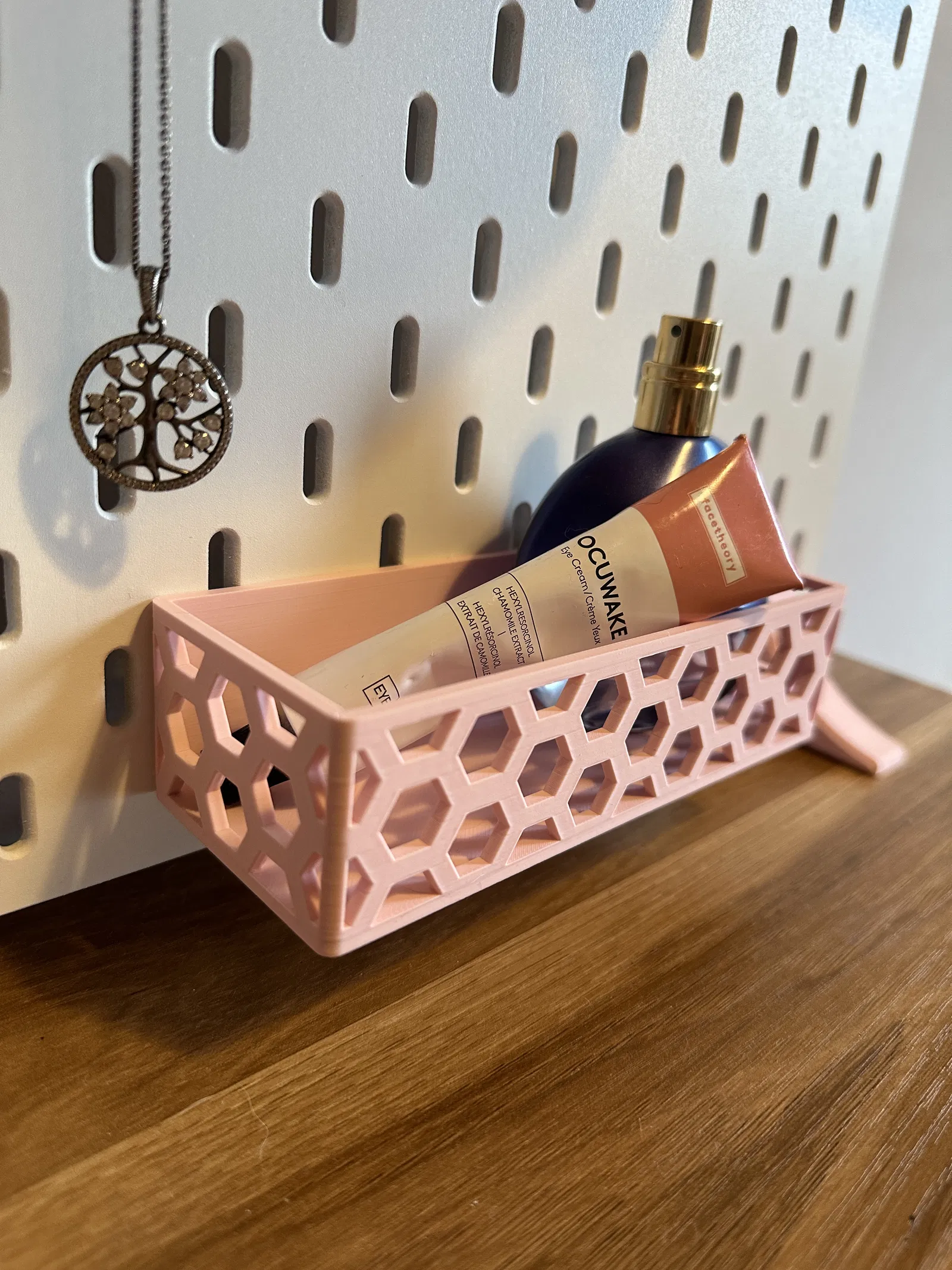 Khay đựng đồ cỡ vừa cho Tấm bảng pegboard Ikea Skadis, với họa tiết lục giác độc đáo. Kích thước 15cm, lý tưởng để cất giữ vật dụng nhỏ. In bằng PLA, chỉ cần đế đỡ cho phần móc.