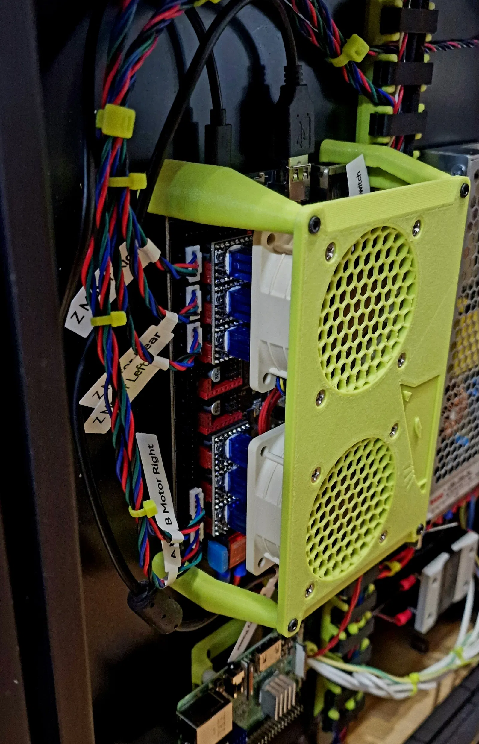 Giải pháp tản nhiệt cho bo mạch điều khiển Octopus 1.1 trên máy Ratrig V-core 3, sử dụng 2 quạt 60mm. Bộ phận in 3D này thay thế các ốc đệm nylon tiêu chuẩn và cung cấp khả năng làm mát hiệu quả hơn cho các stepstick.