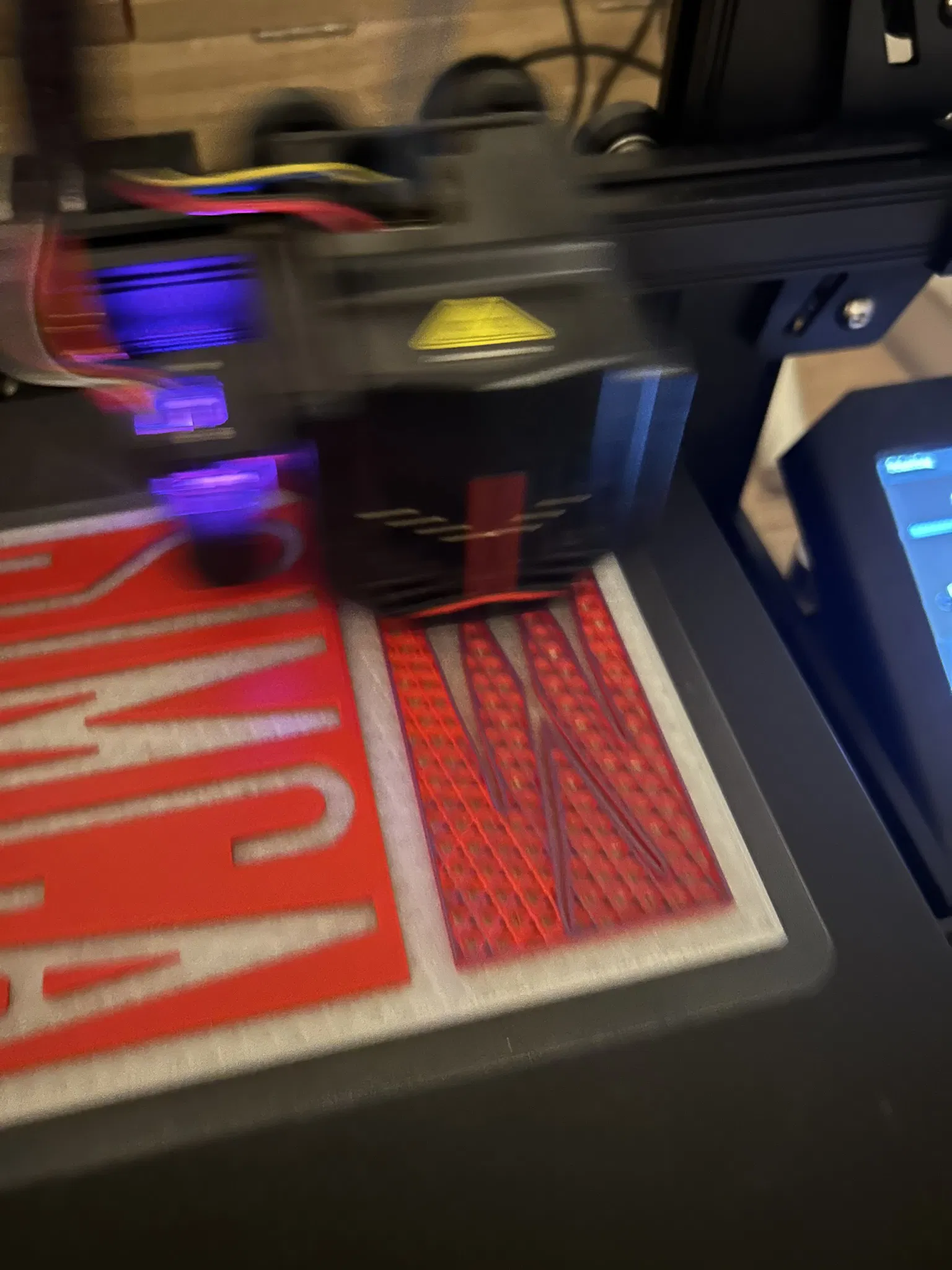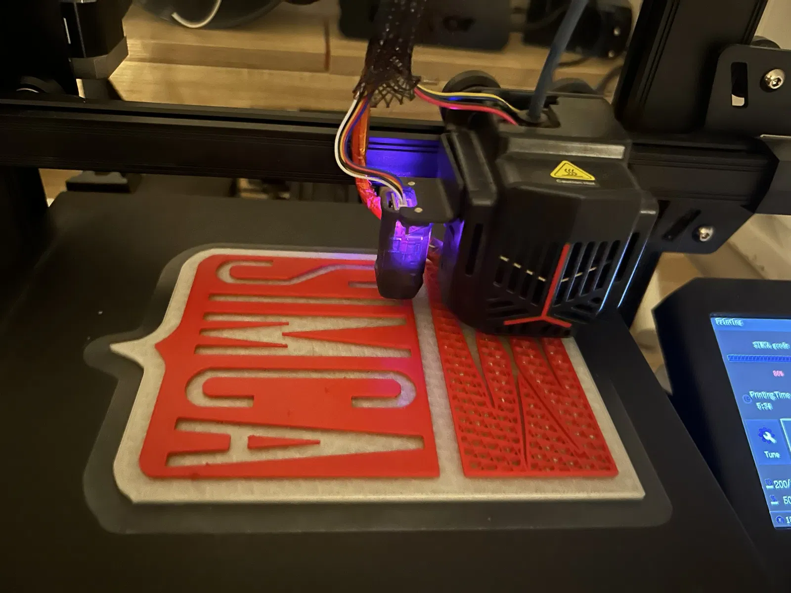 In logo Simca với việc đổi màu sợi in trong lúc in. Lớp đầu tiên: trắng phát quang. Lớp thứ hai: Đỏ. Và cuối cùng là màu xanh dương.