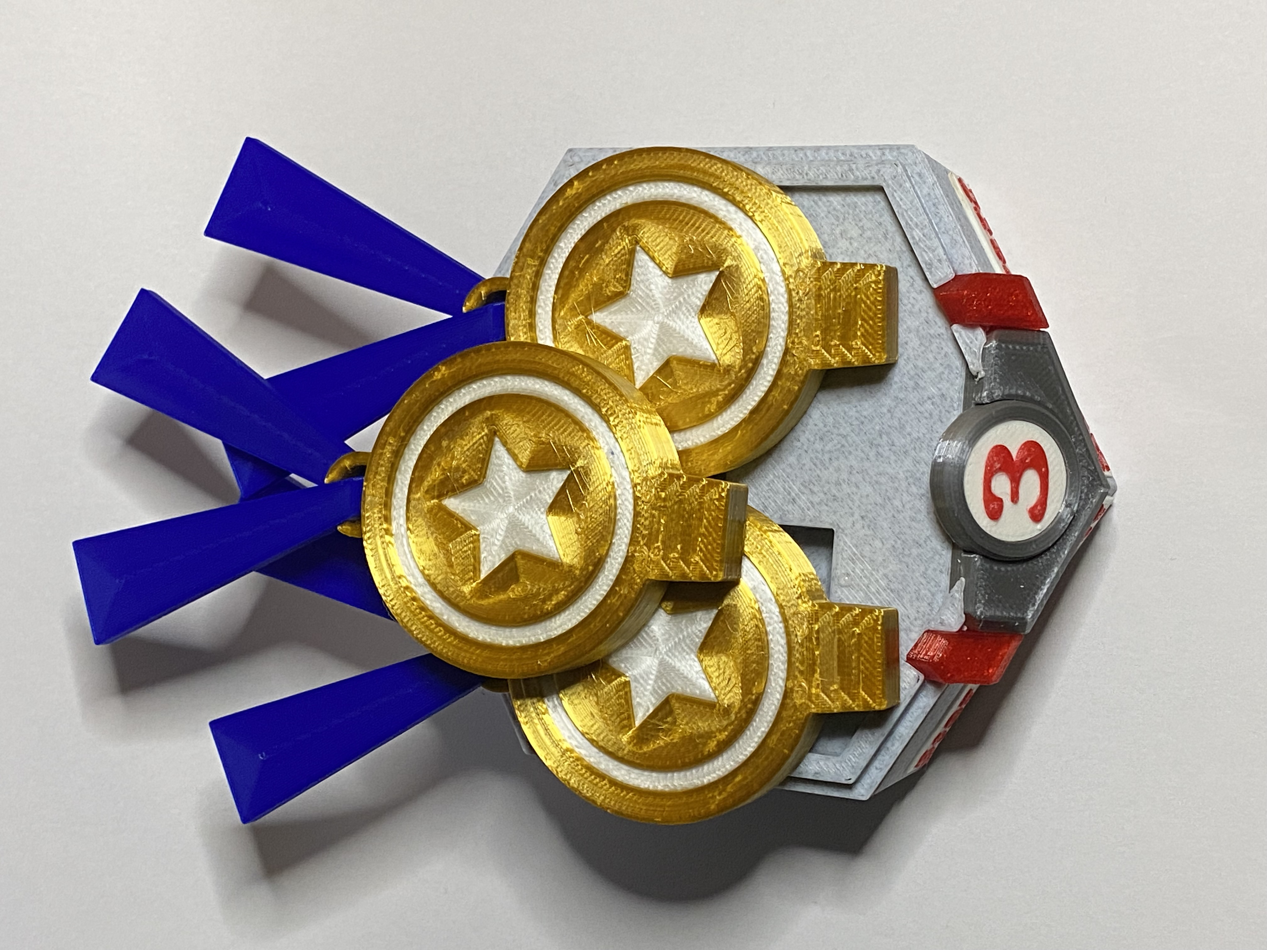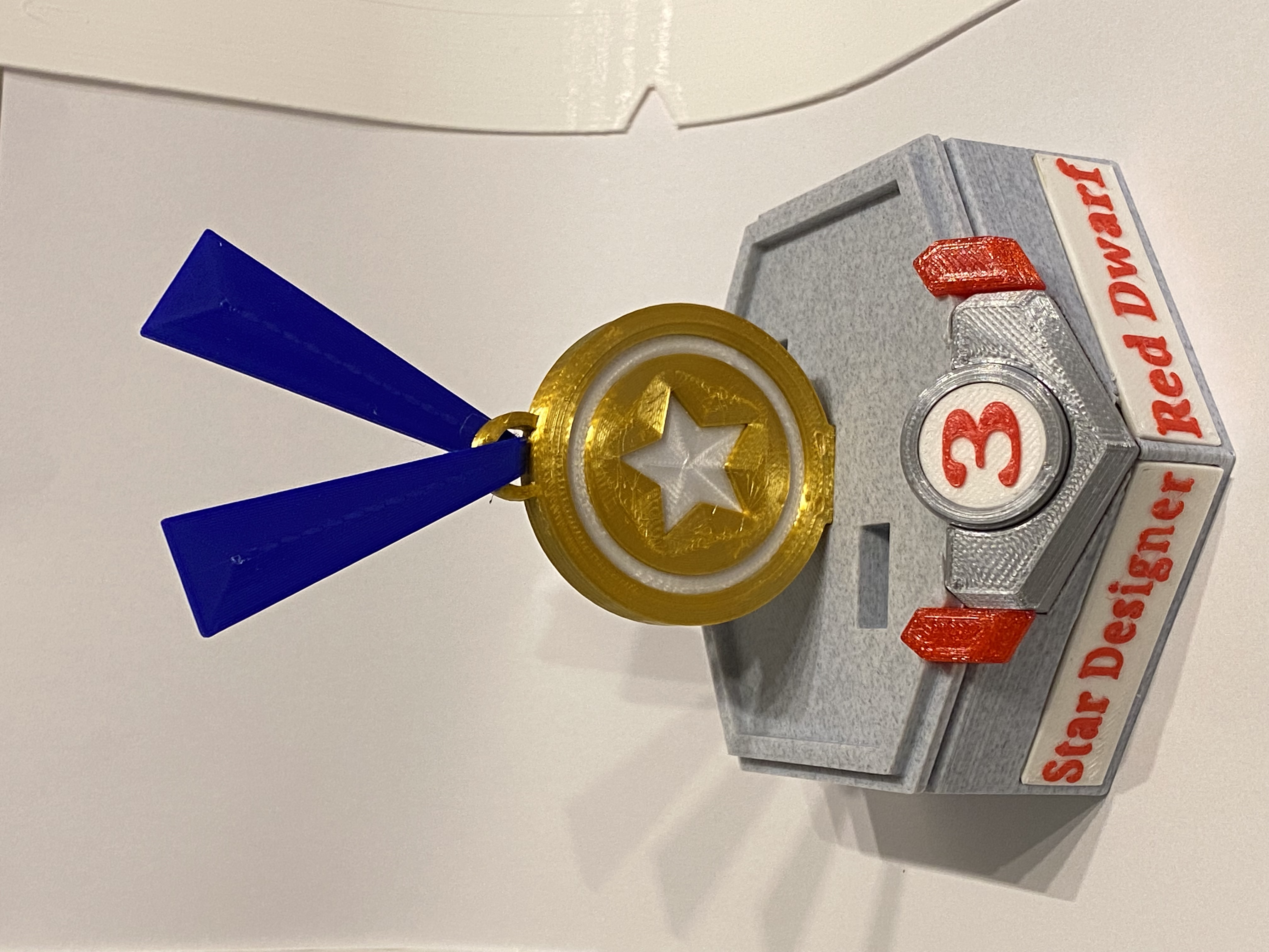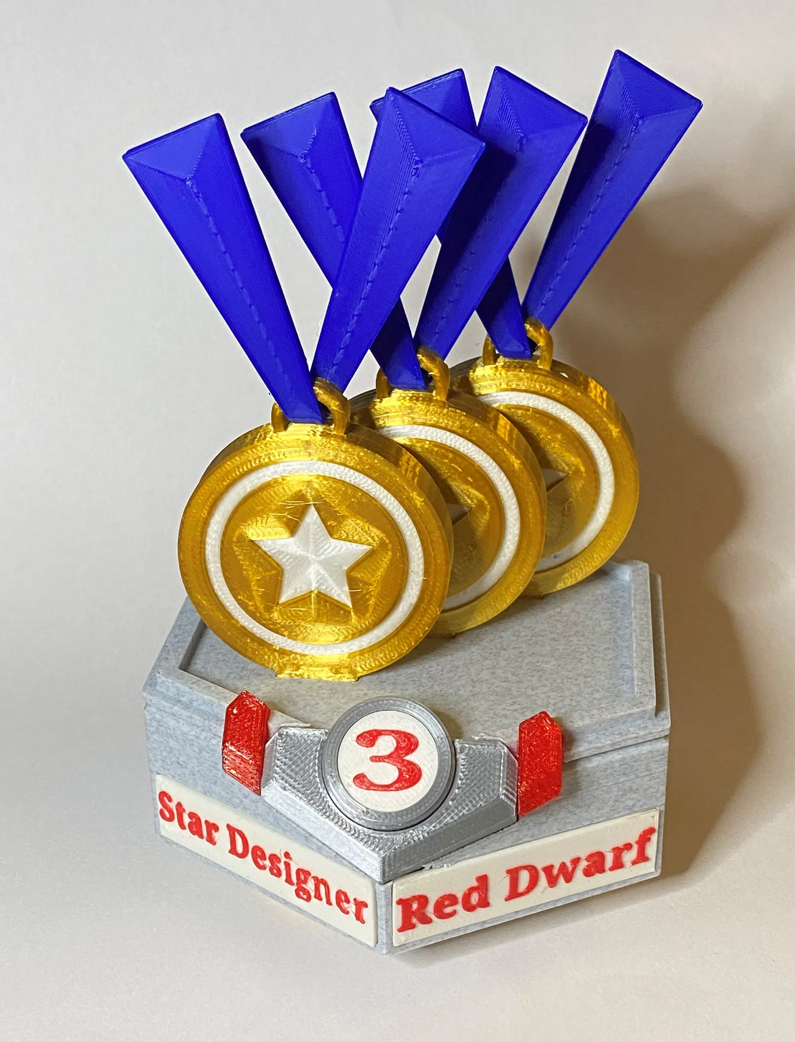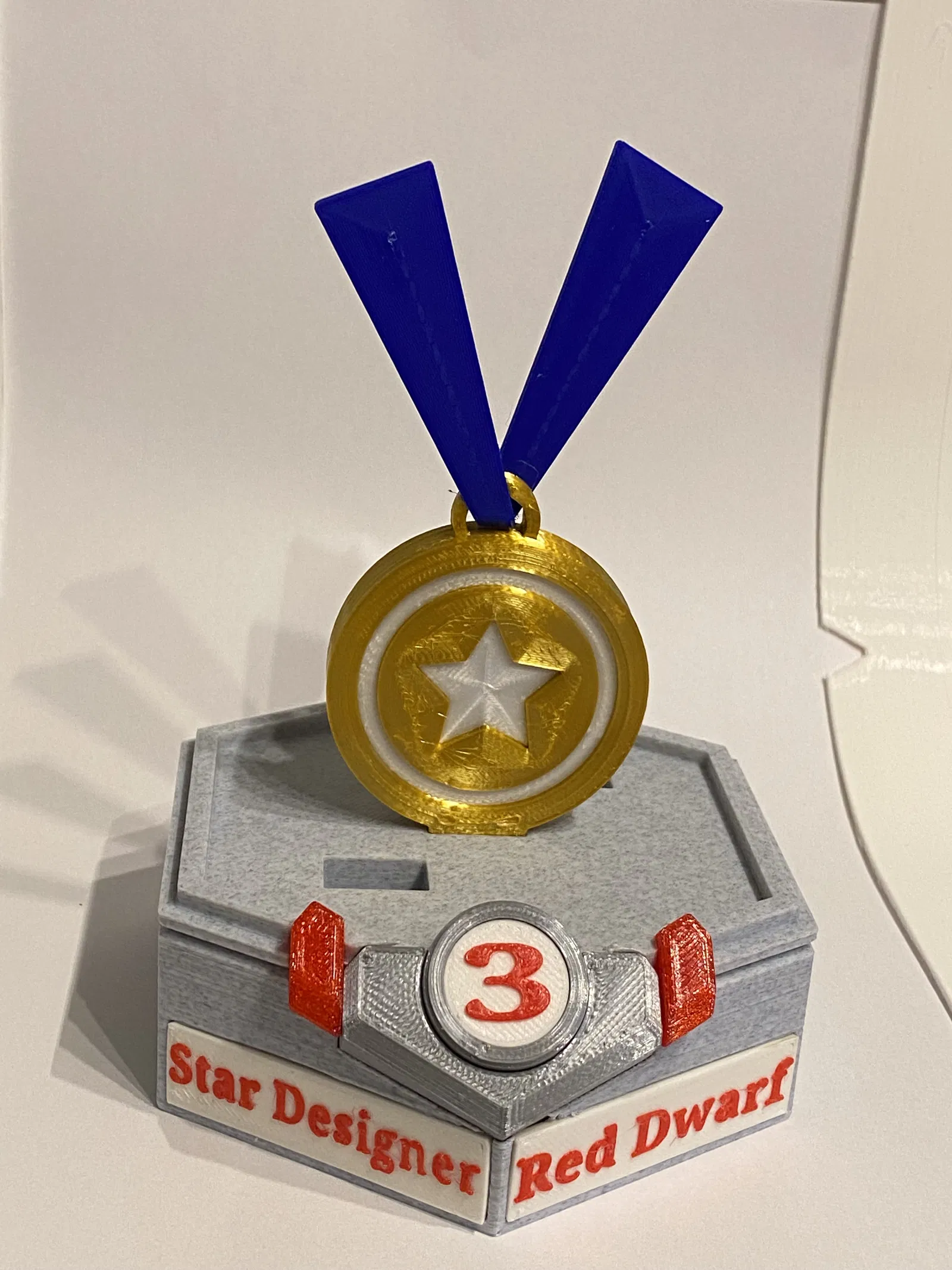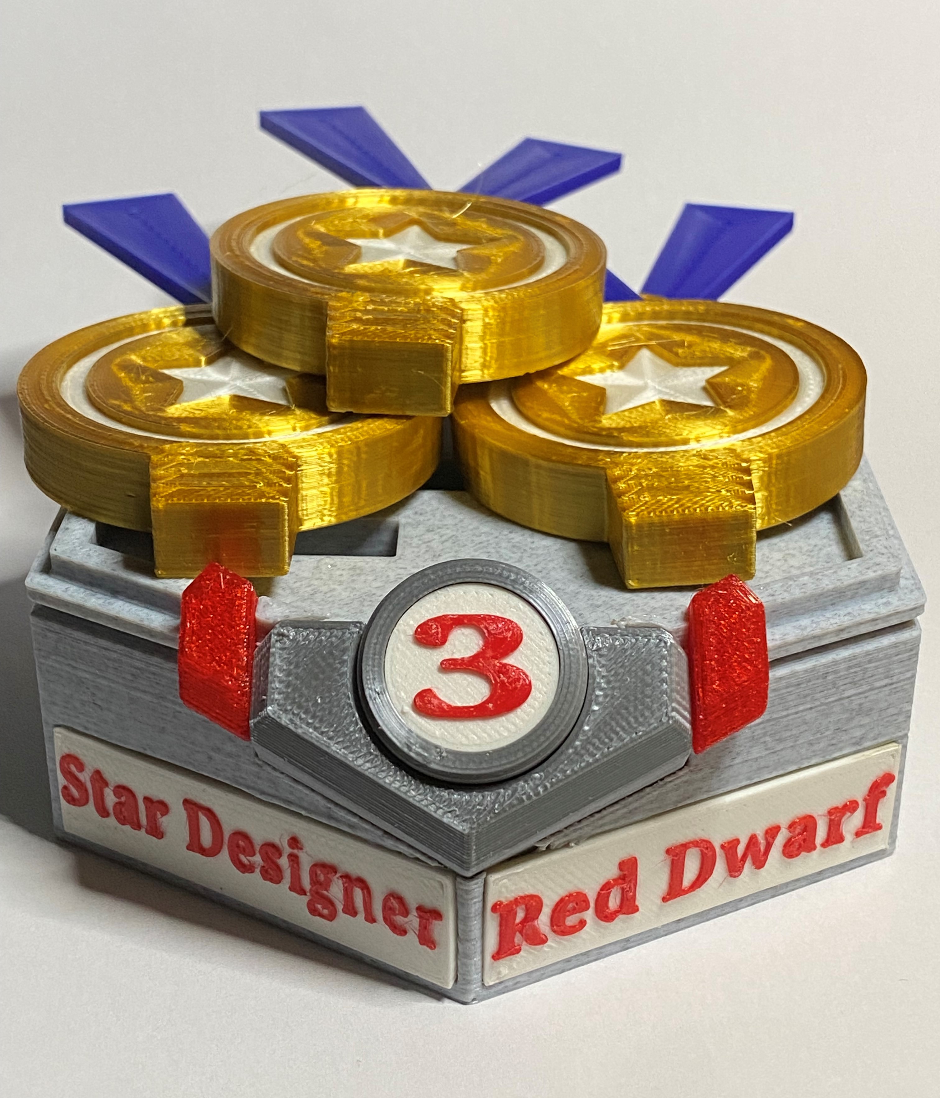 Mô hình huy hiệu "Red Dwarf" này là một phần của giải thưởng Star-Designer #3, được thiết kế với nhiều màu sắc và đế trưng bày đẹp mắt. Người dùng có thể tải về tệp STL để in, với lời khuyên về kỹ thuật in ấn và vật liệu.