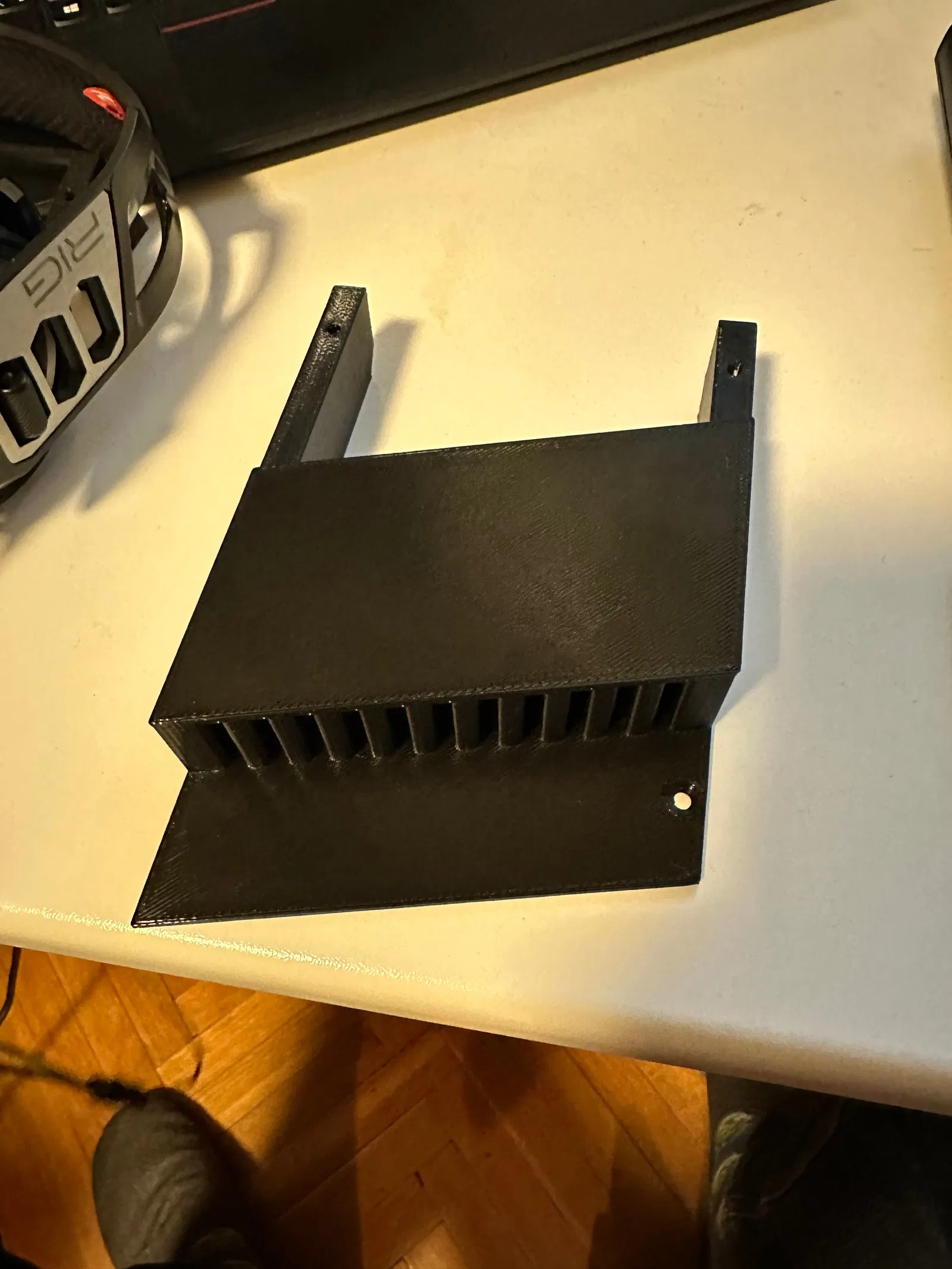 In mẫu holder 2 lần và mẫu support 1 lần, để mặt phẳng nhất lên bàn in (=support úp ngược). Holder có các tab dán để chống cong vênh. Cần 4 con vít M3 đầu chìm dài 12-16mm để lắp ráp, tui dùng vít kim loại, chắc vít gỗ cũng xài được.