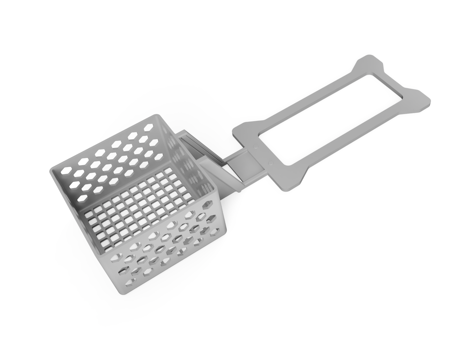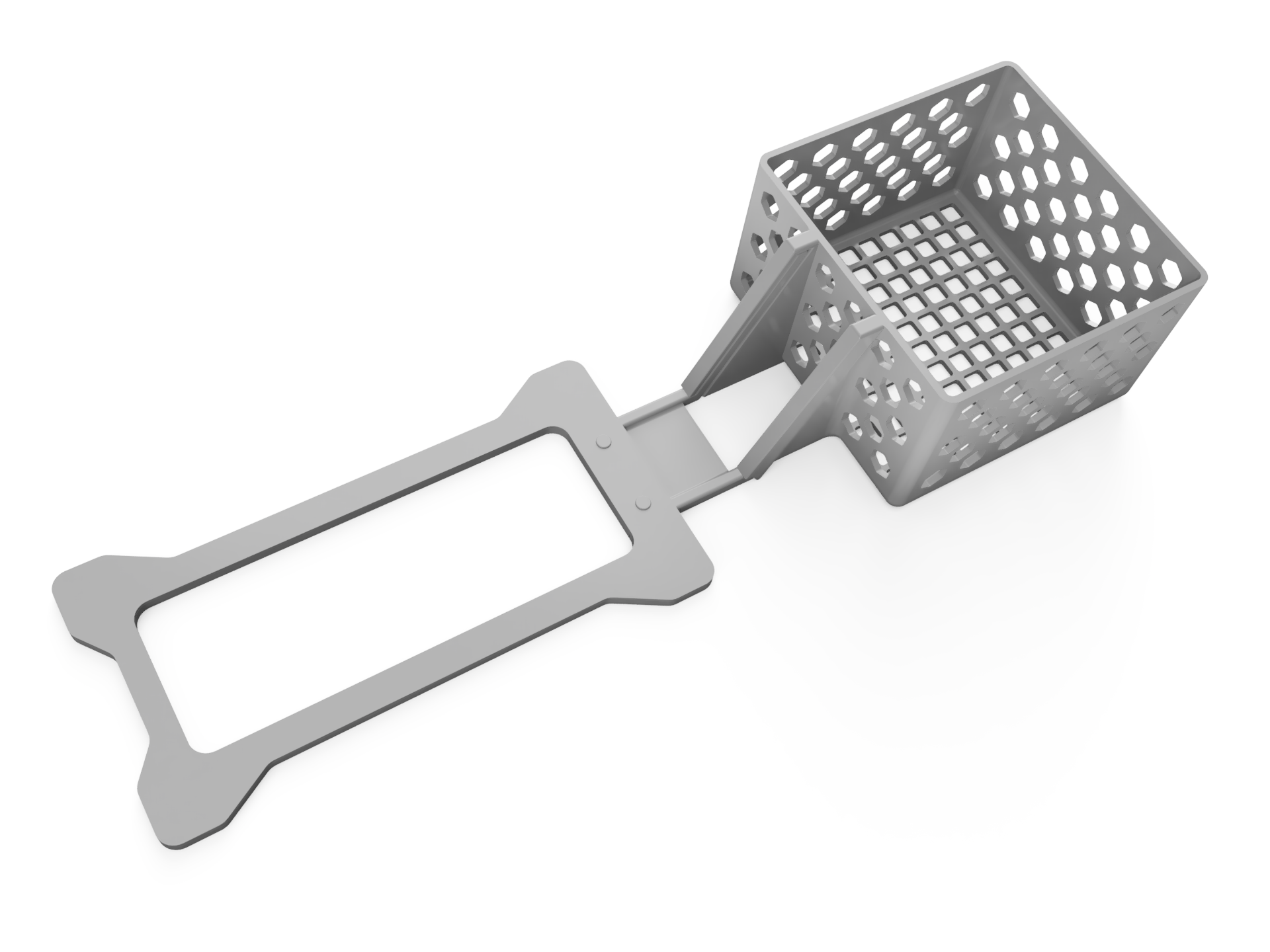 Đây là thiết kế gồm ba phần, sử dụng trọng lượng của chính máy in để giữ rổ đúng vị trí, nghĩa là rổ có thể treo lơ lửng trên cạnh bàn hoặc kệ nếu không gian bị hạn chế.