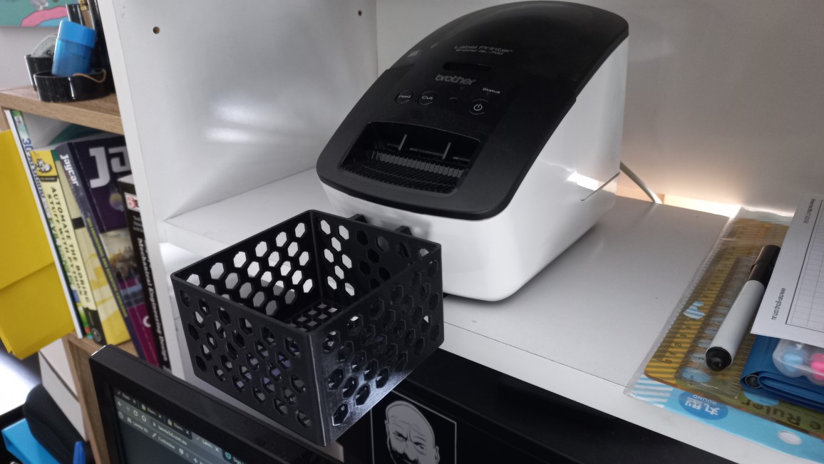 Một cái rổ có thể tháo rời để hứng nhãn từ máy in Brother QL-700, ngăn chúng rơi ra phía sau bàn làm việc. Thiết kế ba phần độc đáo, tận dụng trọng lượng máy in để giữ cố định, cho phép treo trên cạnh bàn hoặc kệ.