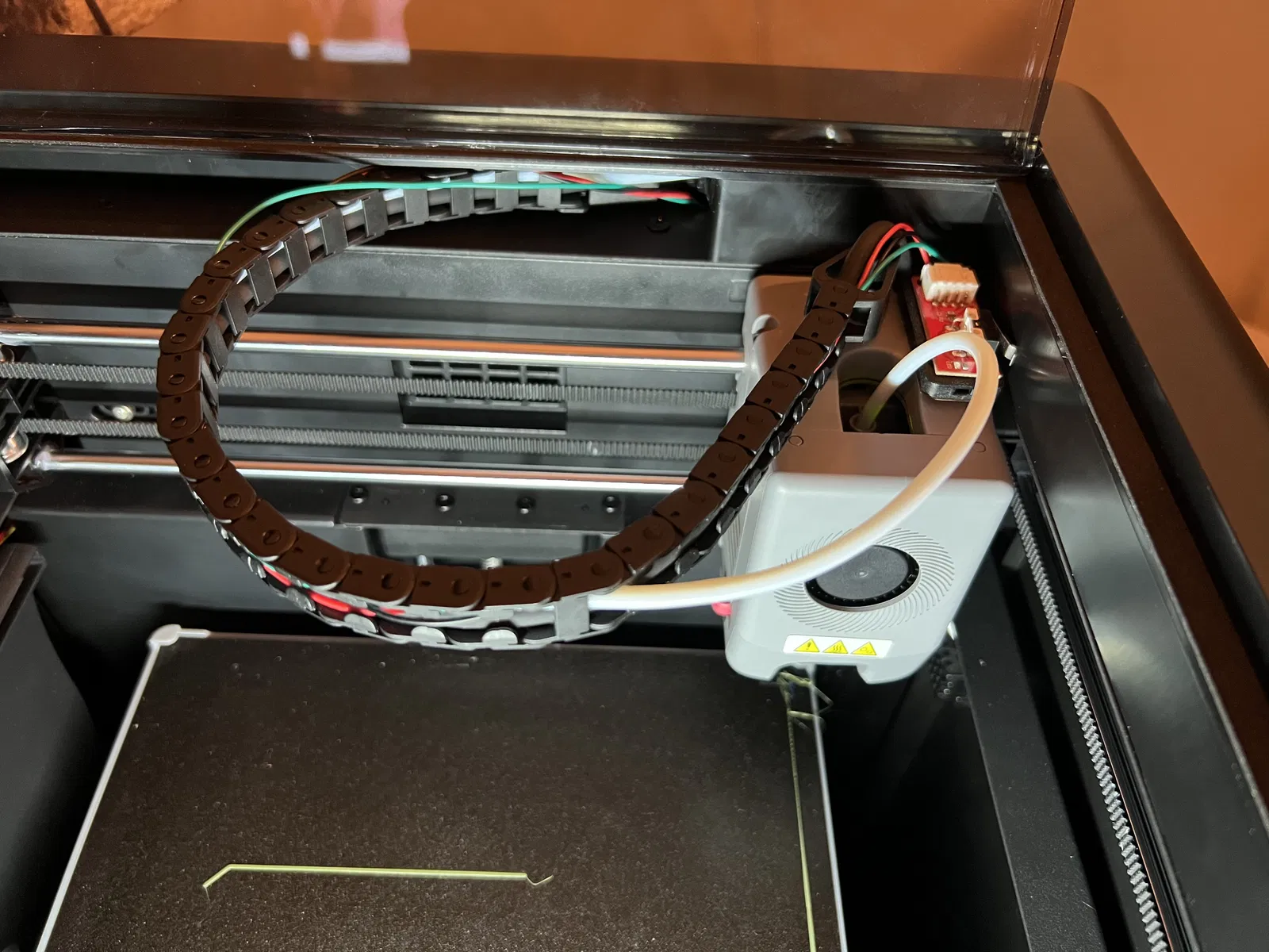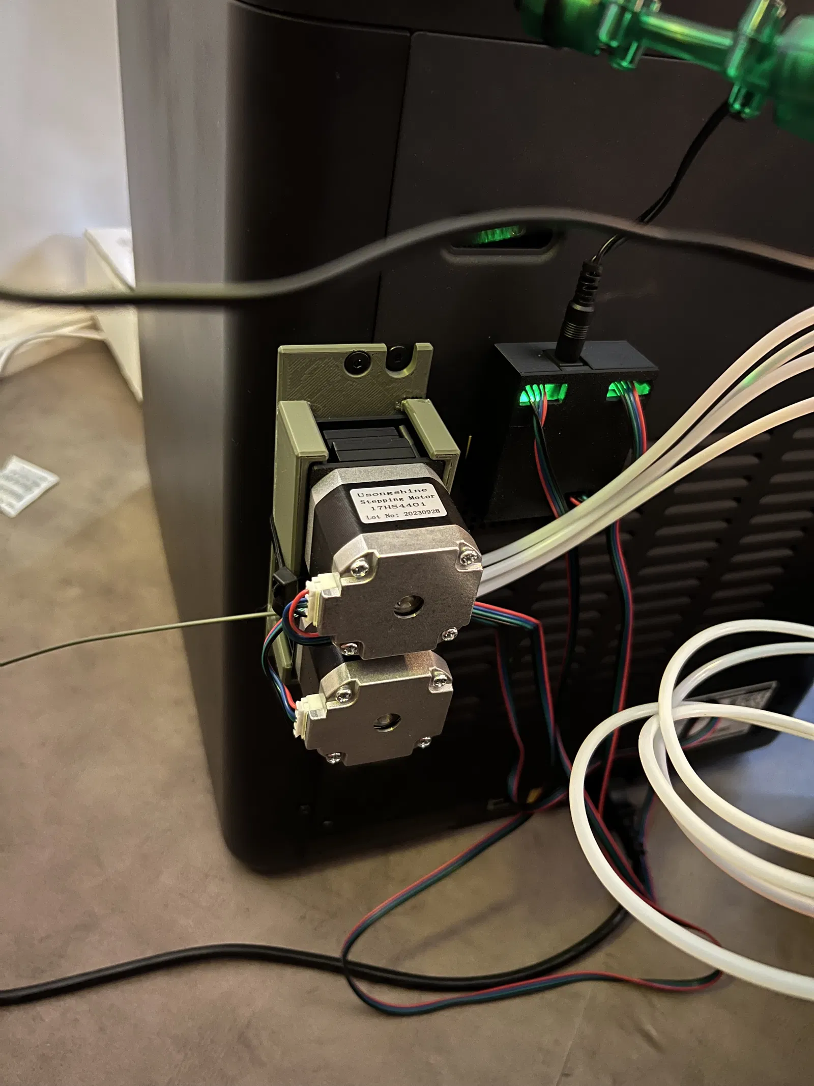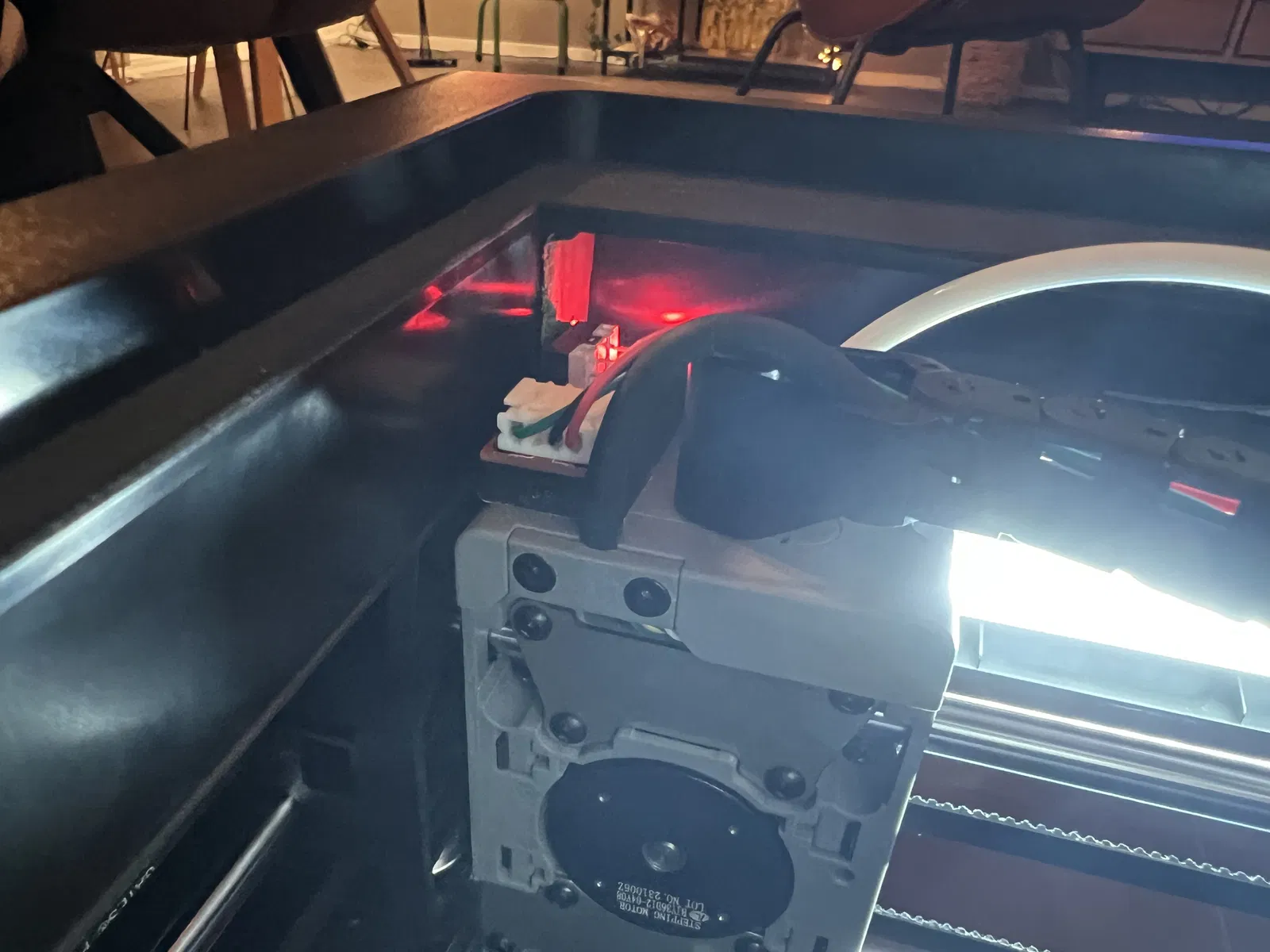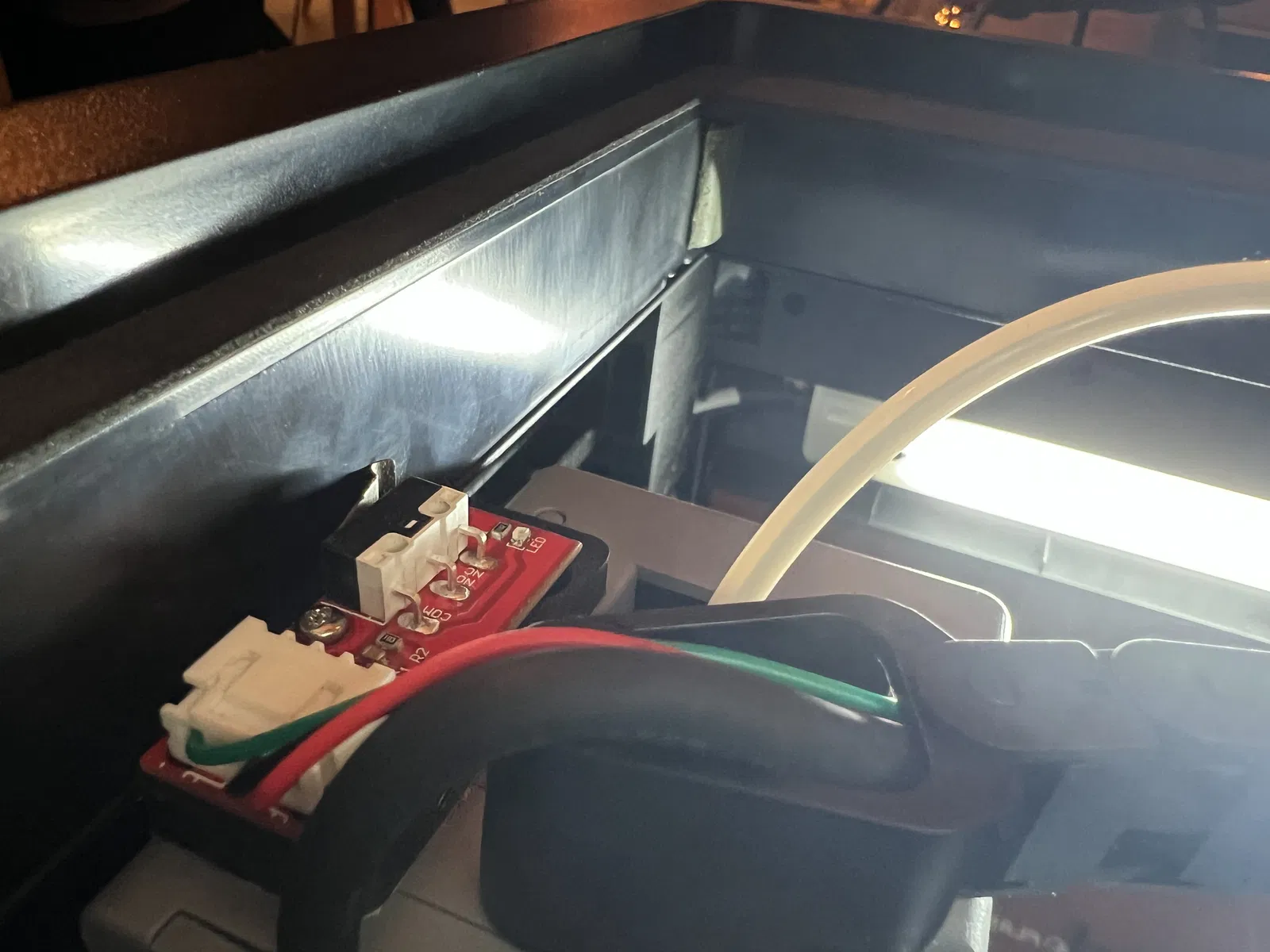 Tôi đã mất nhiều lần thử mới đặt đúng vị trí công tắc. Bộ 3d chameleon có sẵn giá đỡ công tắc và tôi đã dùng cái đó. Tôi đã chà nhám cái núm nhỏ ở dưới đi và dán nó lên đầu máy in bằng băng dính hai mặt.