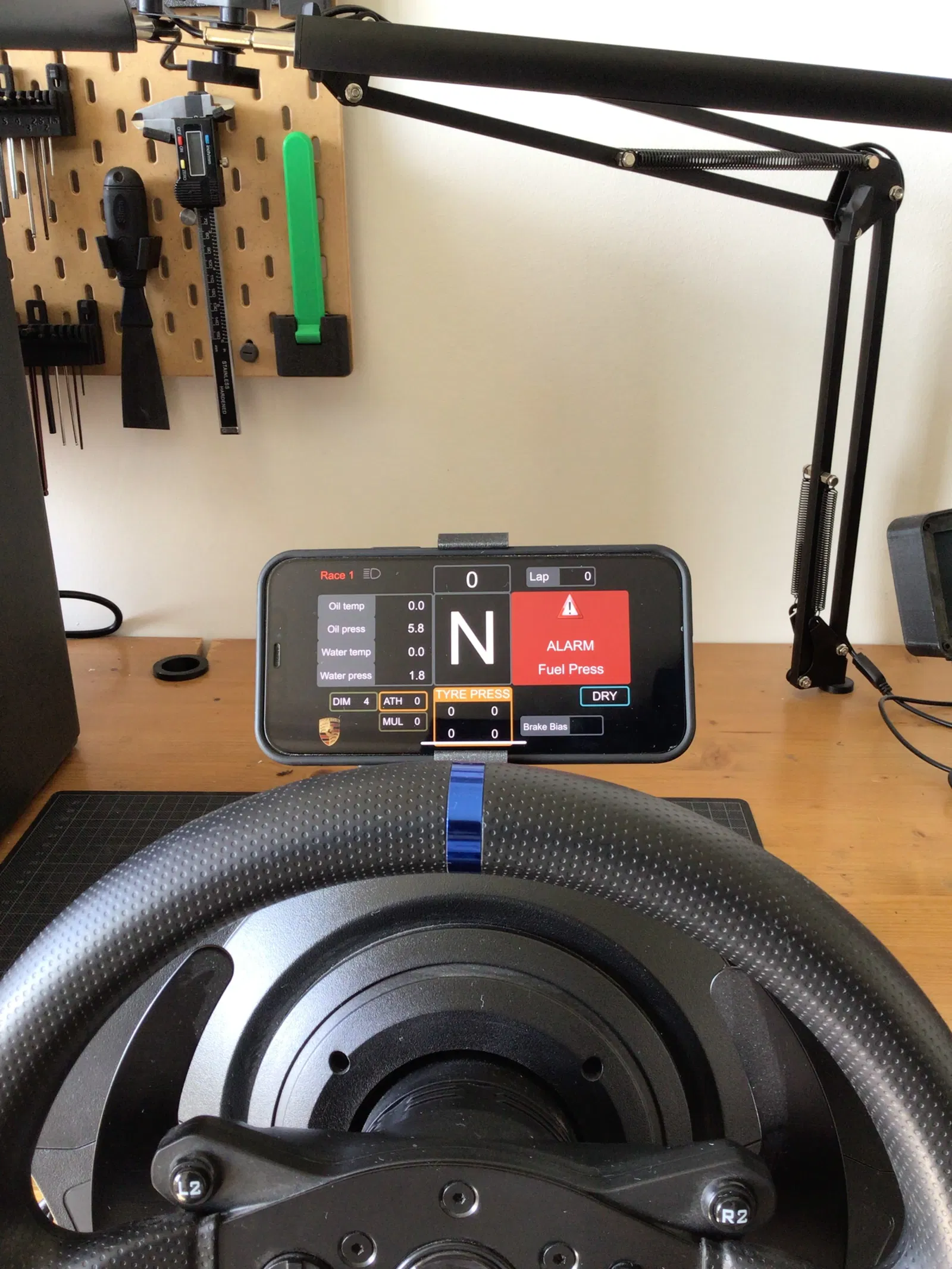 Giá đỡ điện thoại dành cho tay lái Thrustmaster T300 (RS). Hiện tại đang gắn vừa iPhone 12 của mình, nhưng các điện thoại tương tự cũng có thể dùng được. Rất tuyệt khi kết hợp với Simhub Dash để hiển thị một số thông số trong lúc đua xe mô phỏng.