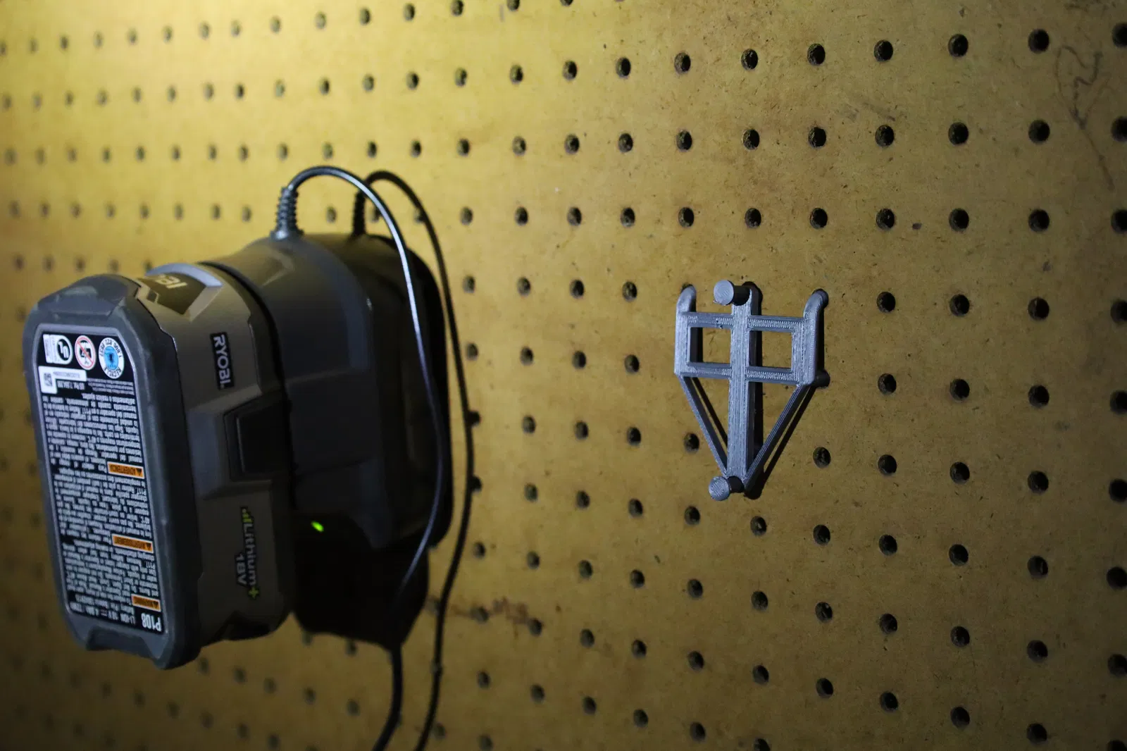 Giá đỡ này giúp bạn gắn bộ sạc pin Ryobi 18V lên bảng pegboard. Dễ dàng lắp đặt, chỉ cần in ra và gắn vào là xong. Phiên bản 'mỏng' cũng đã có sẵn, tiết kiệm vật liệu hơn.