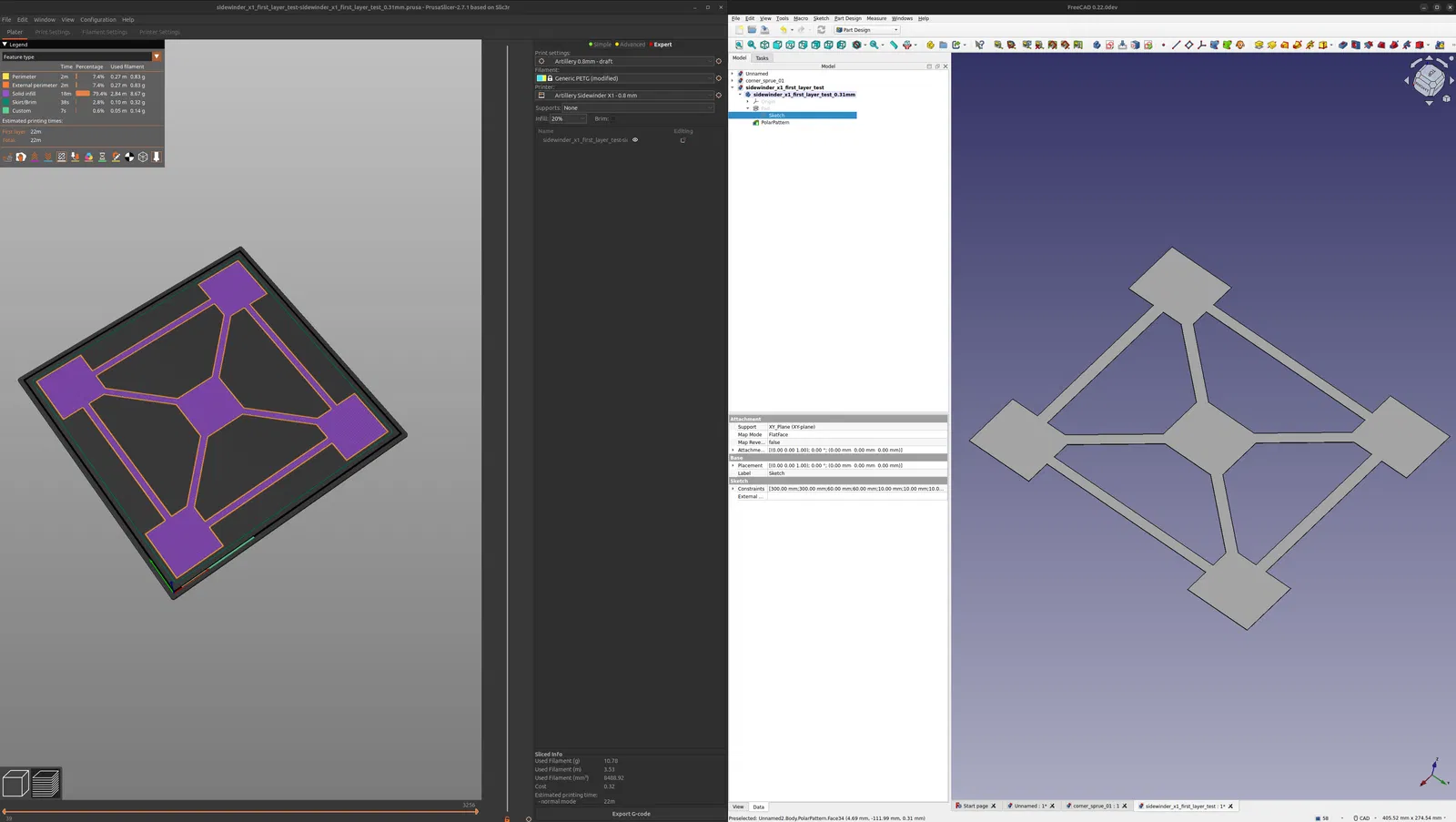 Một mô hình FreeCAD tham số với các ô vuông 60mm phủ lên các điểm chạm cân chỉnh, được nối với nhau bằng các dải 10mm. Mô hình này cũng được xuất với chiều cao 0.31mm để in với các lớp dày trên đầu phun rộng. Điều này sẽ hữu ích trên bất kỳ bàn in vuông 300mm nào, với chiều cao có thể tùy chỉnh trong FreeCAD bằng cách chỉnh sửa khoảng cách pad trong cây để phù hợp với chiều cao lớp khác.