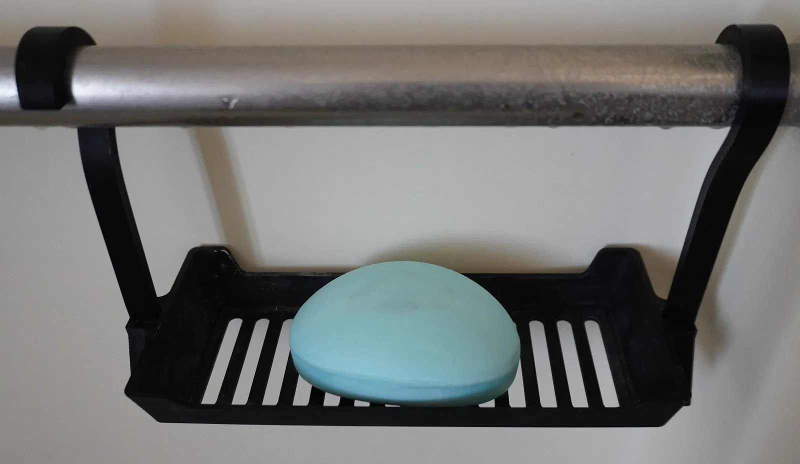 Cái kệ phòng tắm kiểu dáng đẹp này để được xà phòng nè. Có lỗ thoát nước nên xà phòng không có bị dính đâu nha. Mỗi lần là để được 2 bánh xà phòng đó. Nên dán keo mấy cái móc vô khe nha. Thiết kế vừa cho thanh ray tròn 22.2mm luôn đó.