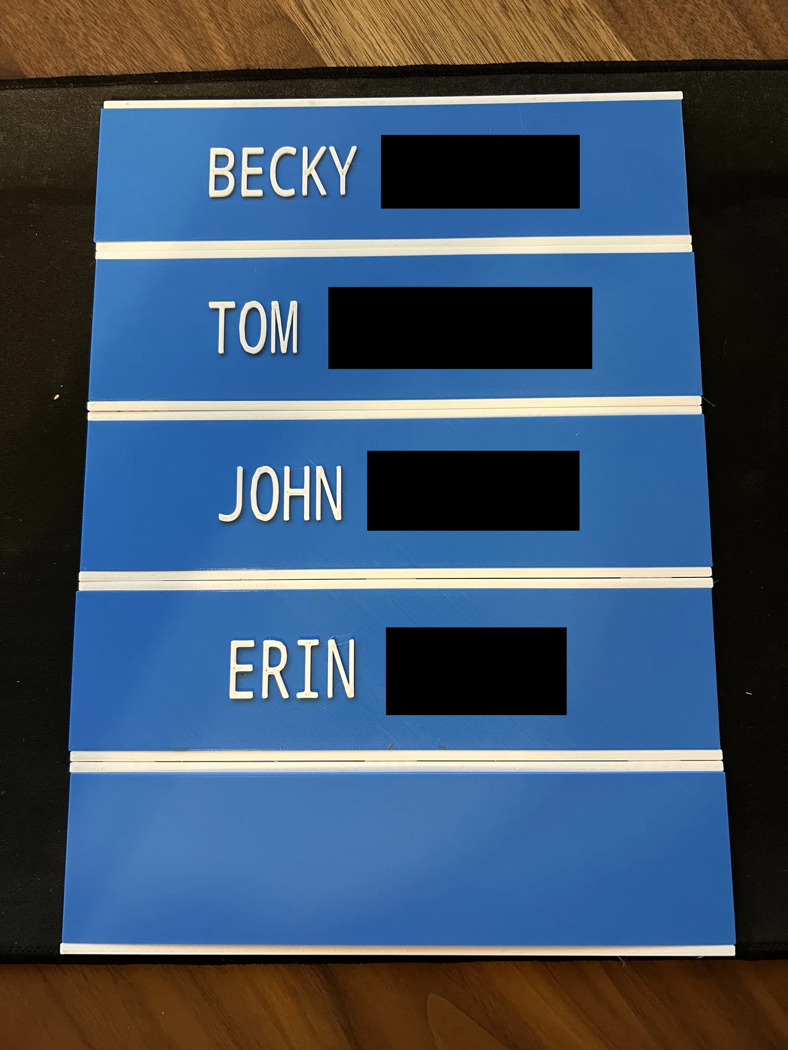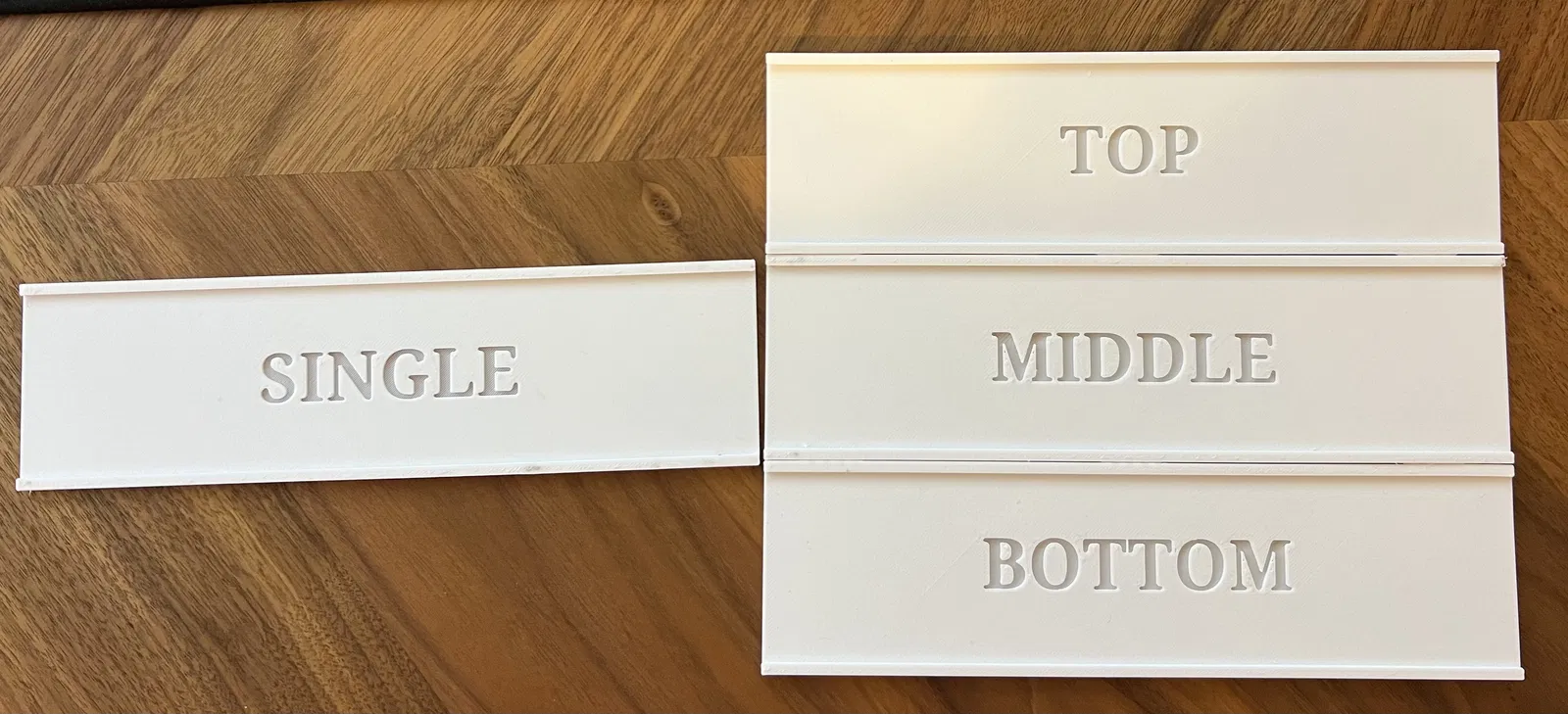 3 bảng tên (Sử dụng Trên, Giữa, Dưới) 4 hoặc nhiều bảng tên hơn (Sử dụng Trên, Giữa, Giữa,…., Dưới) Được thiết kế để in tại chỗ và lắp ráp với nhau để có độ khít thực sự với vẻ ngoài sạch sẽ.