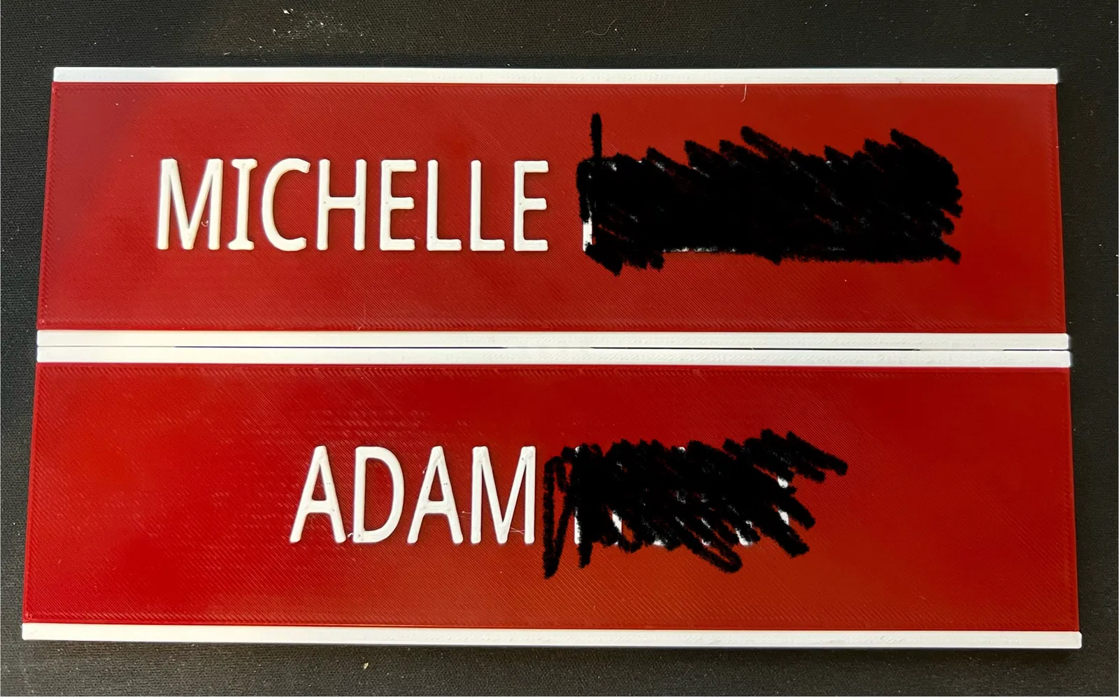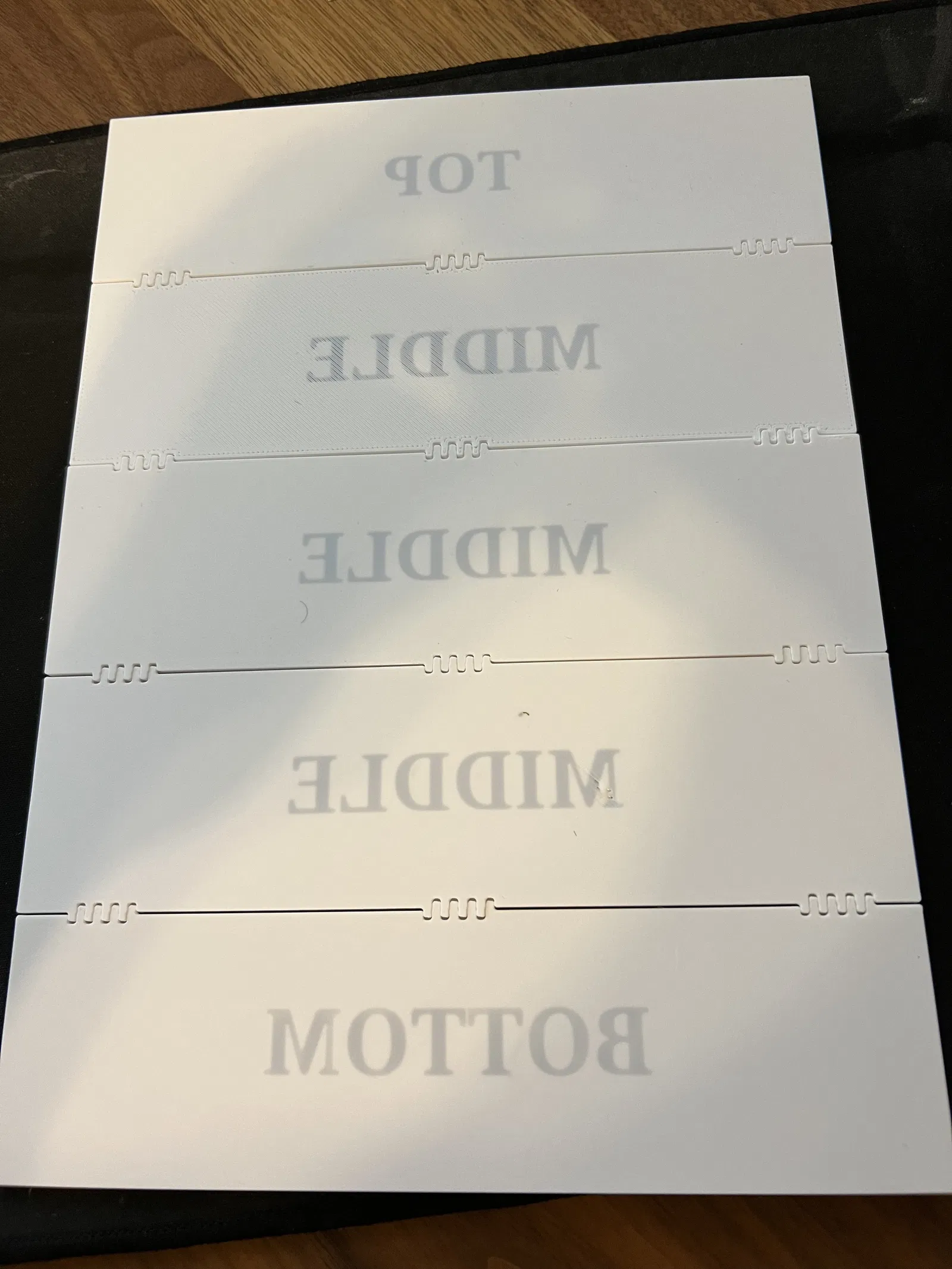 Tôi đã xóa văn bản TOP, MIDDLE, BOTTOM được nhúng và thay thế bằng một mũi tên đơn giản ^ ở góc trên cùng bên trái của mỗi bộ giữ. Tôi cảm thấy rằng nếu bạn in cái này với 2 màu, màu cơ bản giống với màu của đế bảng tên thực tế, thì khi bạn tháo bảng tên ra, nó sẽ hiển thị trống. Xem ảnh đính kèm hôm nay với đế màu đỏ tía và khung màu trắng.