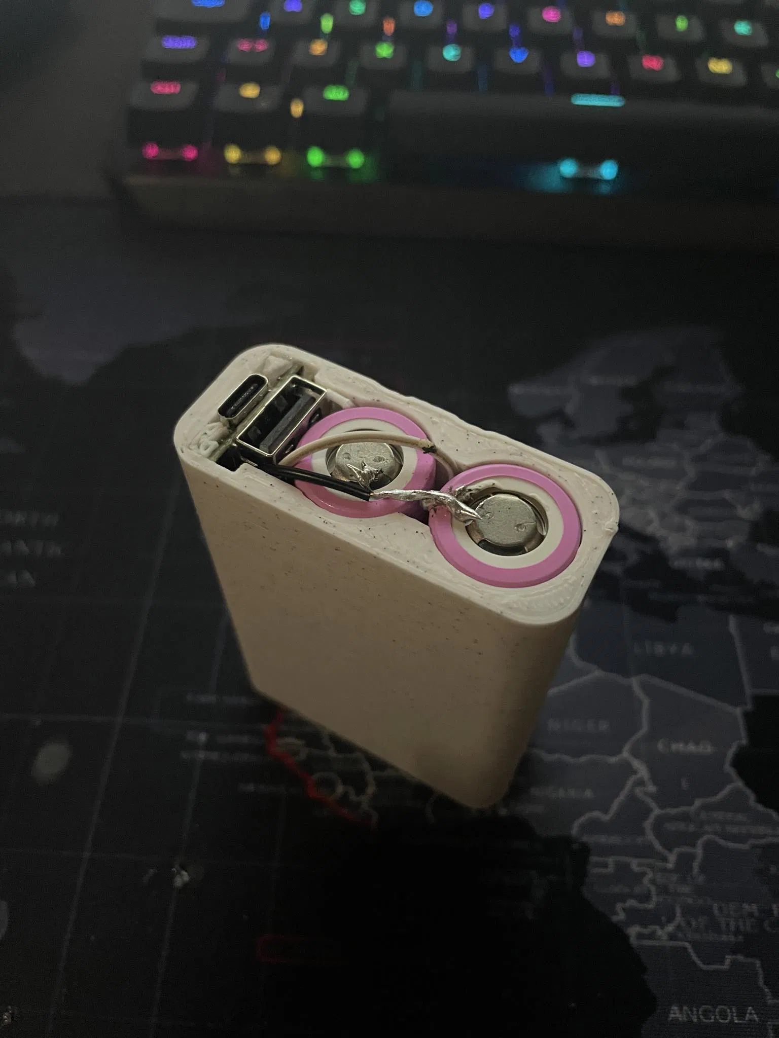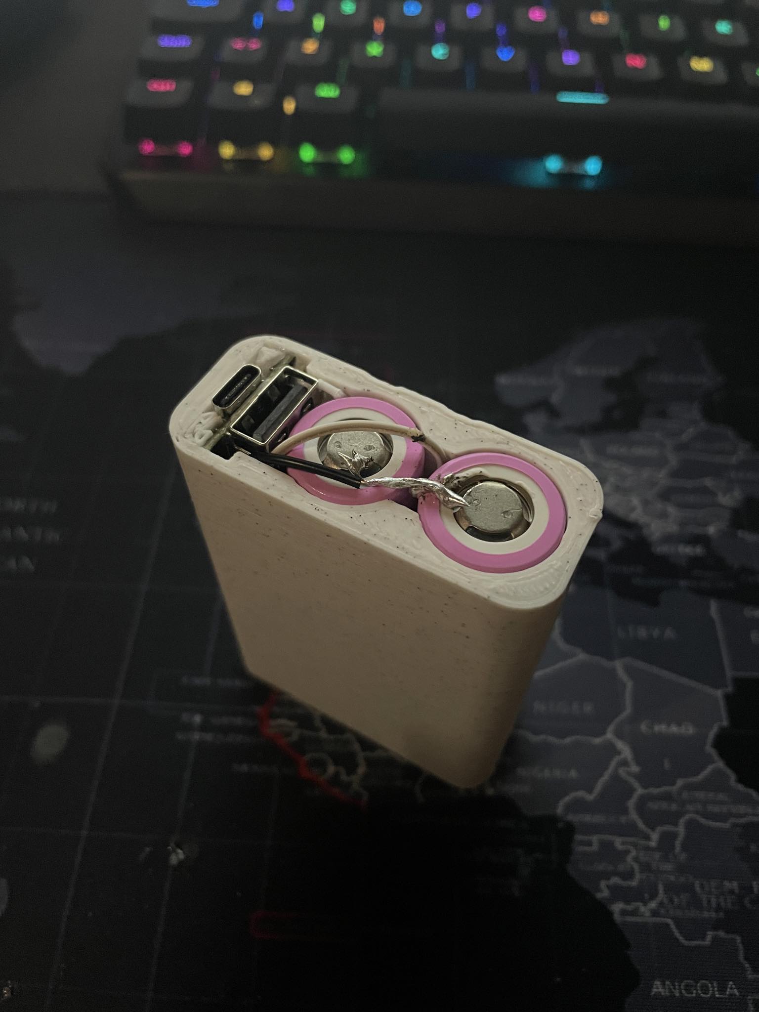 Sạc dự phòng được chế tạo dựa trên module STEP UP 5V 2A Li-ion USB-C và 2 viên pin lion 18650 3.6V, có đèn LED báo mức pin ở cạnh hộp.