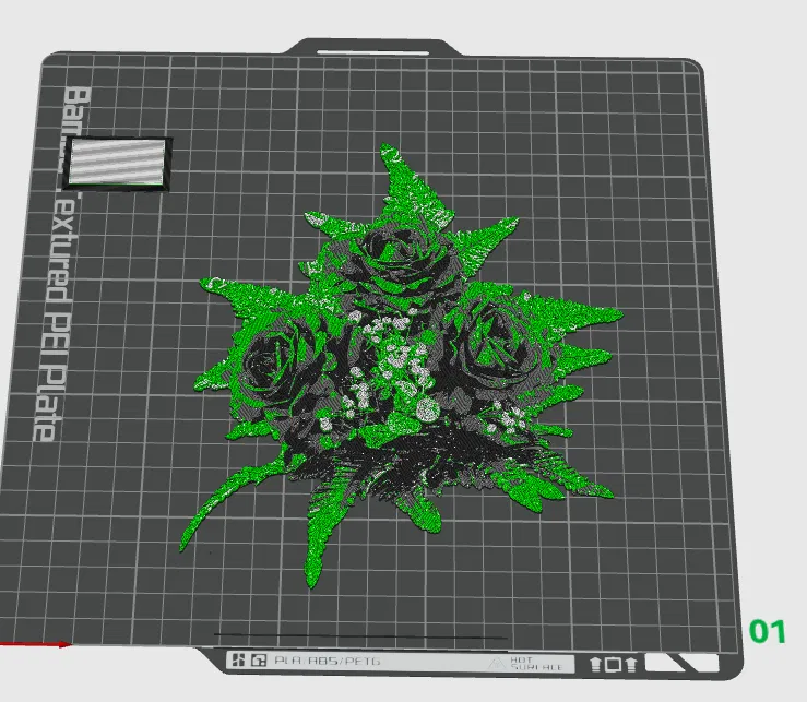In 100% infill với chiều cao lớp 0.08mm và lớp nền 0.16mm. Sử dụng các màu Black, Gray, Green, White. Chi tiết các bước chuyển màu được ghi rõ theo số lớp và độ dày.