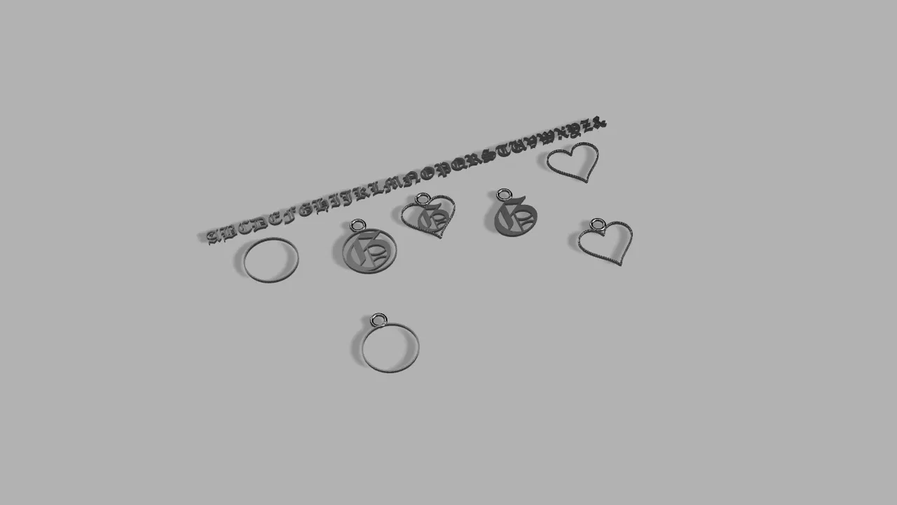 Trang sức tùy chỉnh sử dụng font "Gothic" (Old English Text MT) định dạng .stl để tự làm trang sức. Có sẵn hình trái tim, hình tròn và torus để làm phụ kiện móc nối.