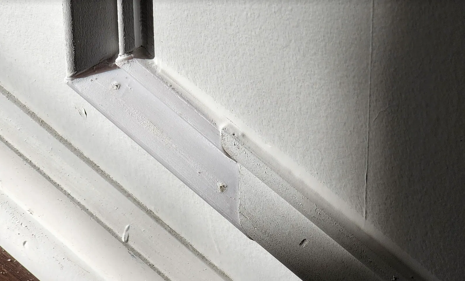 Mô tả về việc tạo ra một mảng nẹp tường bị thiếu cho ngôi nhà bằng cách sử dụng in 3D. Bản in PET-G đã được chà nhám, sơn lót và sơn màu để phù hợp với phần còn lại của bức tường.