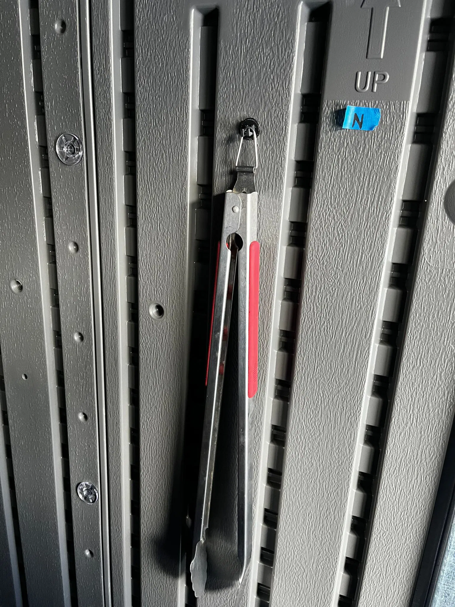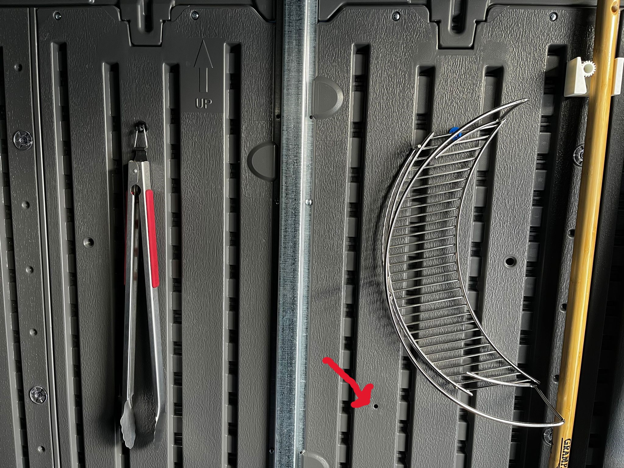 Tui có thiết kế mấy cái móc nhỏ để xài cho cái nhà kho Suncast á (mấy cái lỗ nhỏ xíu trong hình thứ 2 nha mấy ông), cái tui đang xài là loại BMS7780 - 7'x7'. Mấy cái móc này xài ngon lành cho đồ nhẹ nhẹ thôi nha, như trong hình mọi người thấy tui có treo cái vỉ nướng Webber với cái kẹp gắp đồ nướng nè.