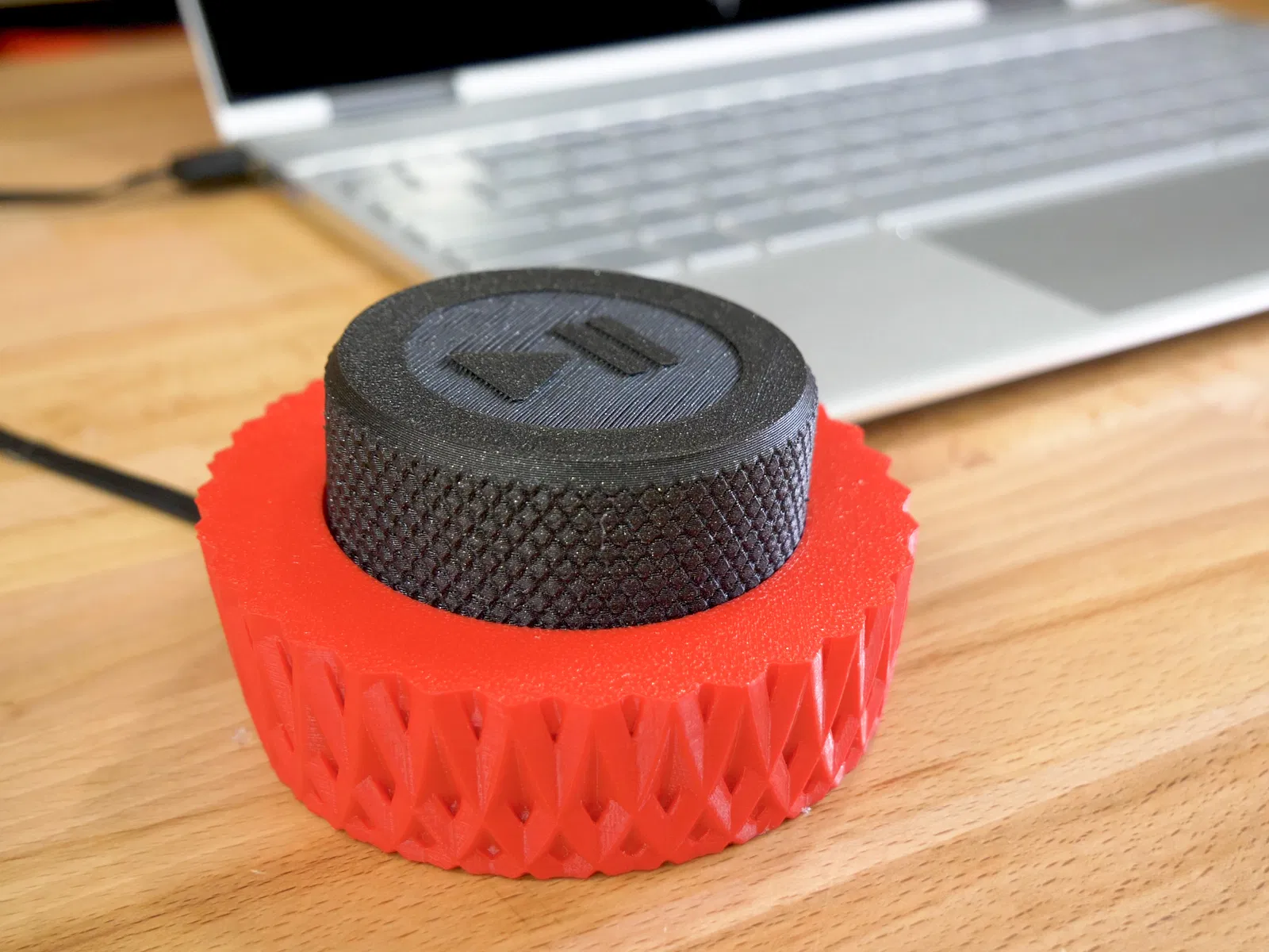 Núm xoay điều khiển media có thể xoay vô hạn và bấm được, được cấp nguồn bởi Arduino, có thể phát/tạm dừng bài hát hiện tại hoặc bỏ qua bài tiếp theo bằng cách bấm đúp. Đọc hướng dẫn tại: https://blog.prusaprinters.org/3d-print-an-oversized-media-control-volume-knob-arduino-basics/ Cái đế này gắn vừa khít nè :)