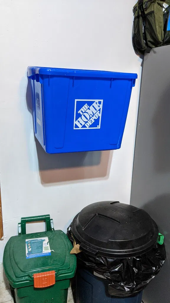 Đây là một cái đế kiểu French Cleat cho thùng rác tái chế của tui nè. Bà xã tui muốn mấy cái thùng rác không còn để dưới sàn nữa, mà cái này thì rẻ hơn nhiều so với cái bộ treo tường của Rubbermaid.