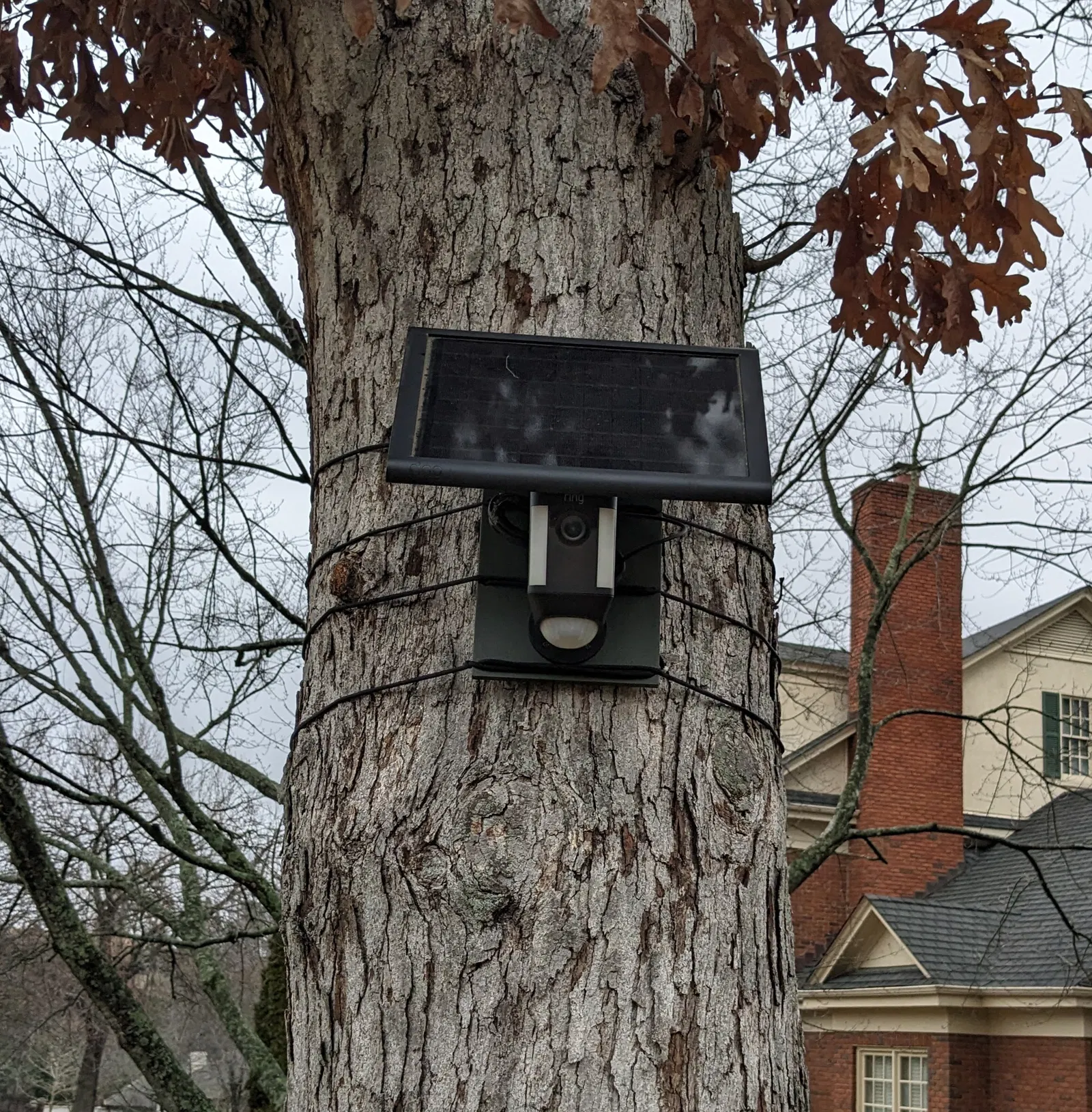 Giá đỡ không làm hỏng cây này gắn Camera Ring và tấm pin năng lượng mặt trời. Tấm pin được xoay ngang để che mưa nắng và thu gọn. Dây dù quấn quanh cây, có thể nới lỏng khi cây lớn lên. Cách quấn dây đơn giản bằng cách dùng tuýp lớn đu dây quanh cây an toàn.